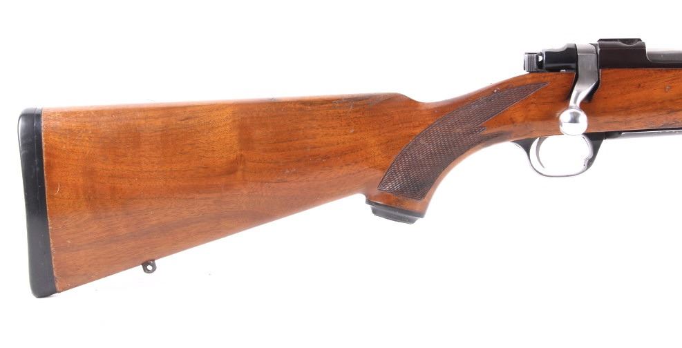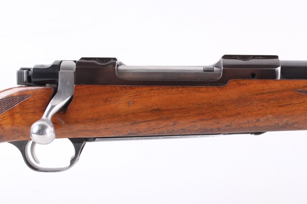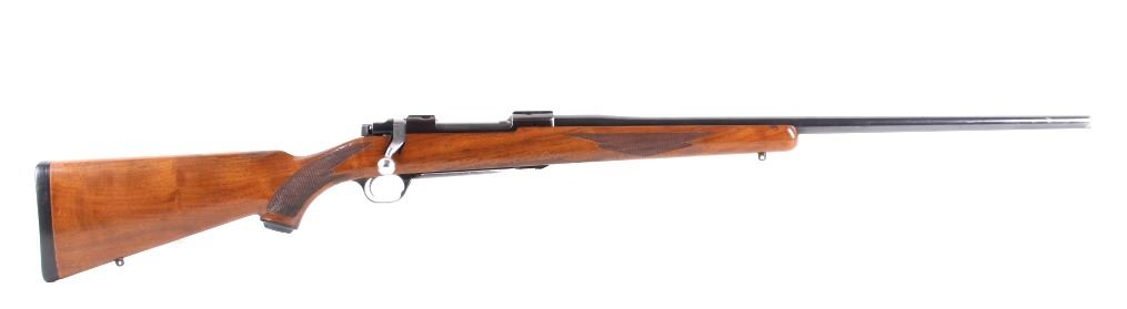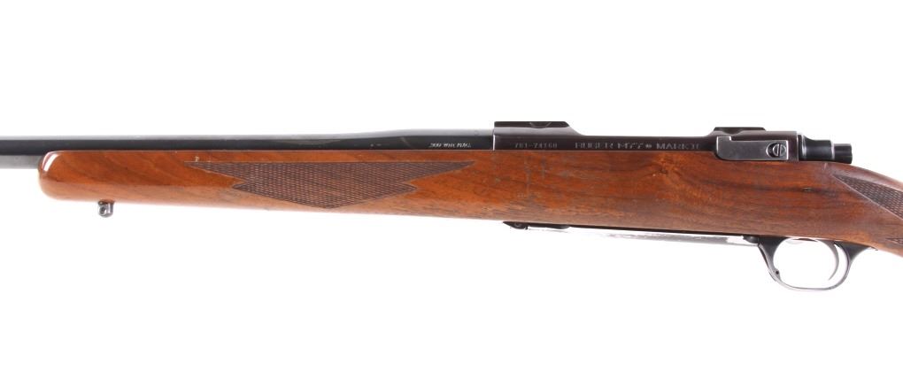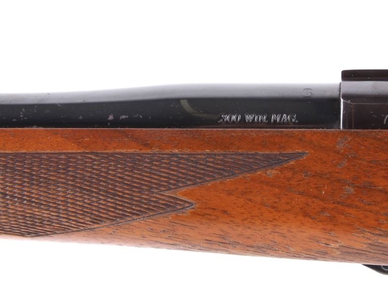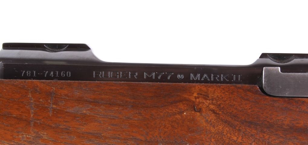 The lot features a Ruger M77 Mark II .300 Win Mag. The rifle features a blued steel finish, 24" barrel, bright nickel bolt handle and bolt, walnut straight grain stock, and skip line checkering. This rifle is in good condition, showing a good amount of bluing, with the floor plate showing the greatest loss. This rifle was manufactured in 1993. Modern rifle. FFL transfer or NICS background check required. Serial number is 781-74160. Rifle measures 44 5/8" L