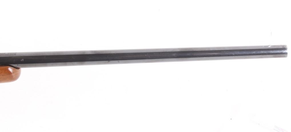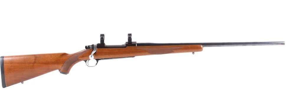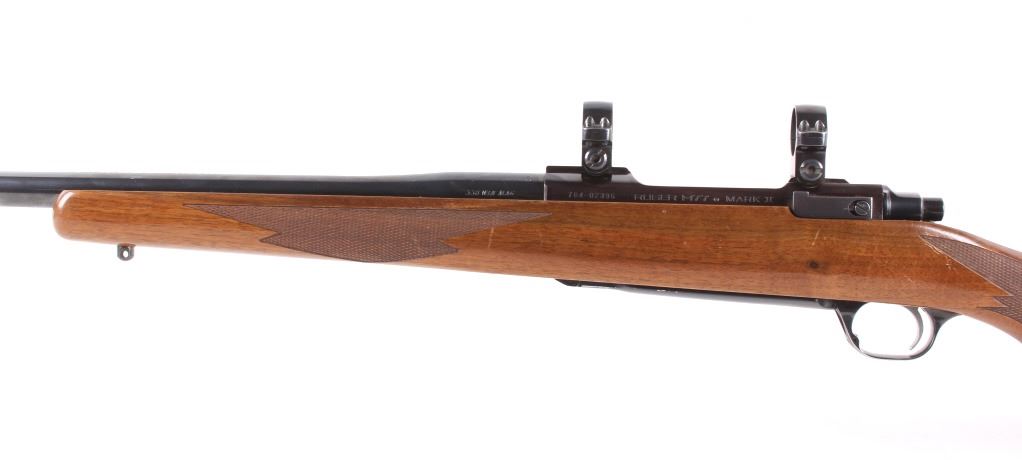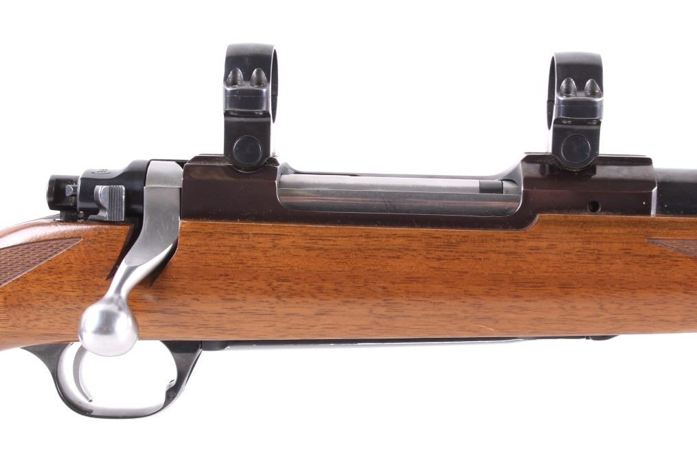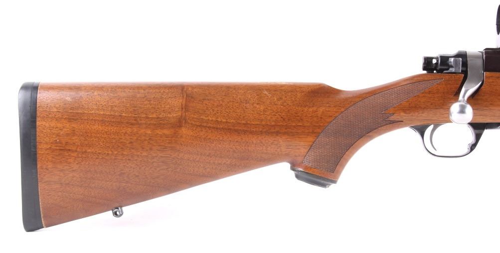 The lot features a Ruger M77 Mark II .338 Win Mag with scope rings. The rifle features a blued steel finish, 24" barrel, bright nickel bolt handle and bolt, walnut straight grain stock, and skip line checkering. This rifle was manufactured in 1996. Modern rifle. FFL transfer or NICS background check required. Serial number is 784-02396. Rifle measures 44 5/8" L
