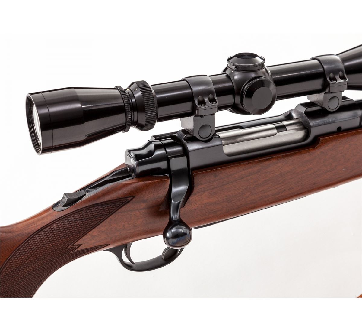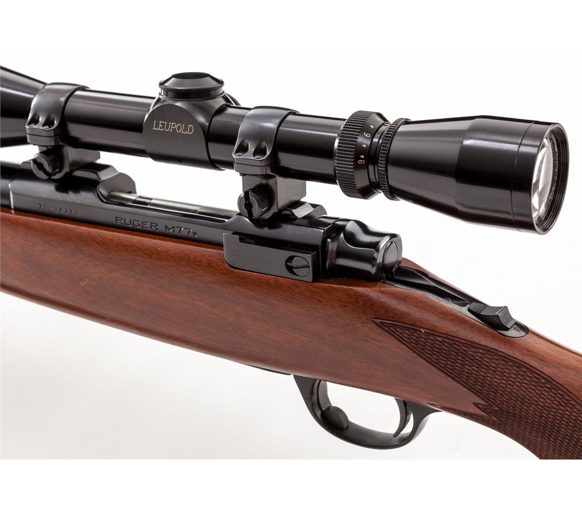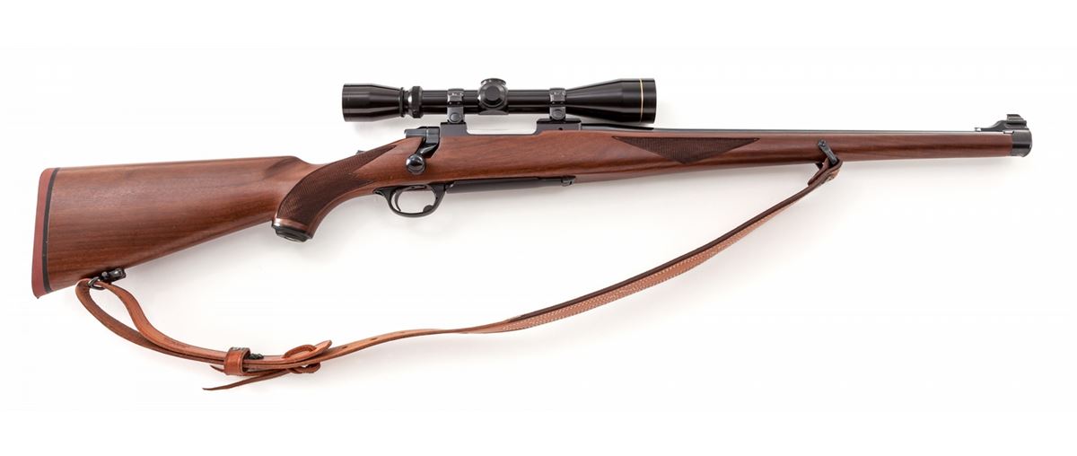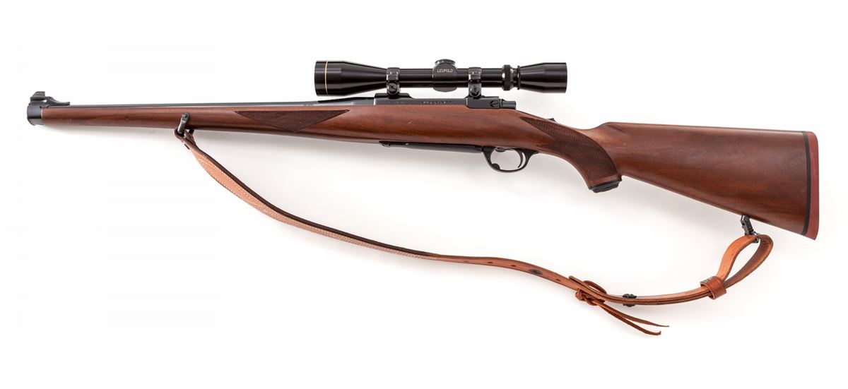 Ruger M77 RSI Bolt Action Rifle, #78-84348, .22-250 cal., 19'' barrel, blue finish, full-length International checkered walnut stock. Topped with a Leupold 3-9x40 Vari-X II scope on Ruger rings, with commercial leather sling. Condition is excellent showing light handling marks to stock. With original box and associated paperwork, from the late 1970s. Est.: $500-$750. (Modern)