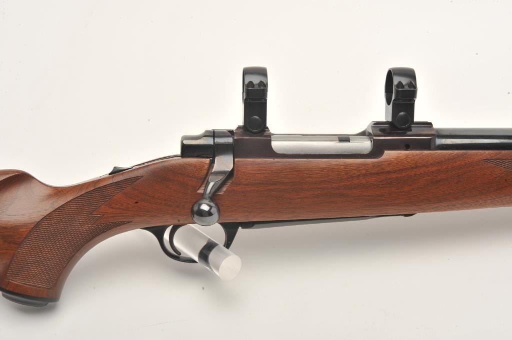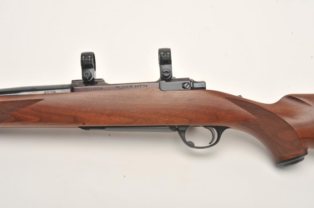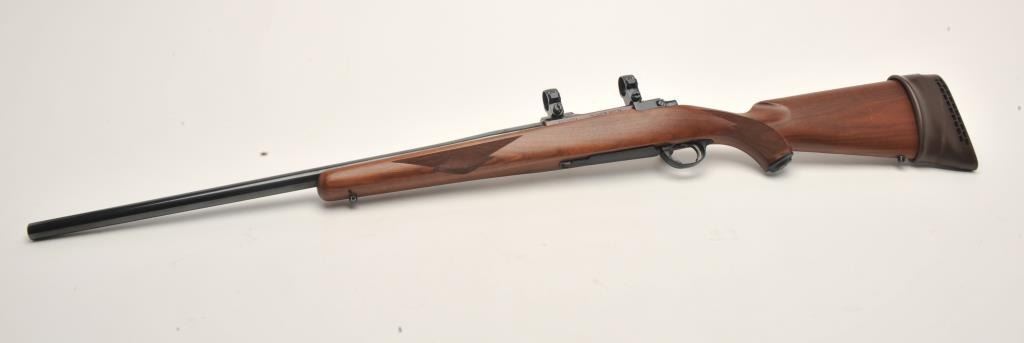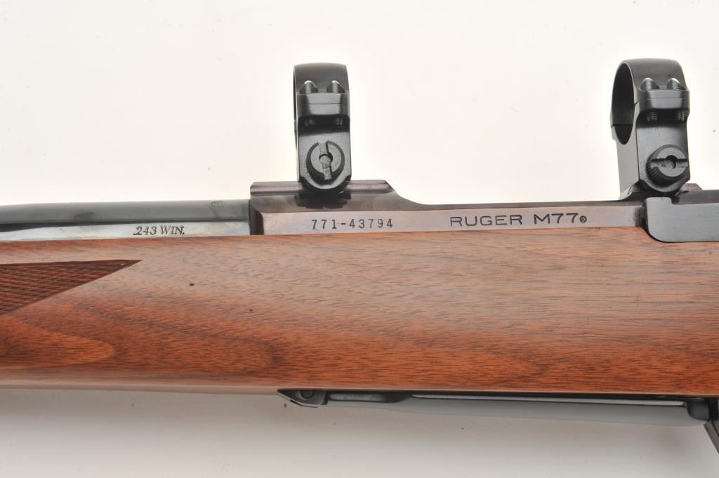 Ruger M77 bolt action rifle, .243 Win caliber, 24” round barrel, blued finish, checkered wood stock, scope rings, S/N 771-43794, in overall fine condition with fine bore, crisp action, sharp markings andfine stock; proximately 99%+ original blued finish remaining. (Modern). Est.: $300-$600.