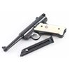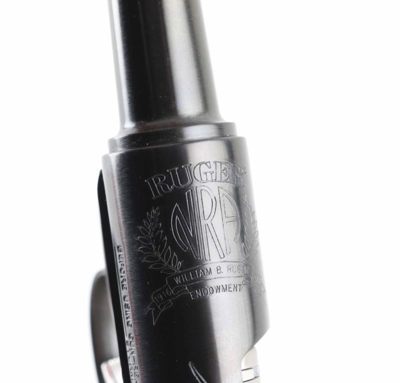 SN: NRA-07868 'William B. Ruger' Semi-automatic rimfire pistol. Features blued finish, checkered white polymer grips with red & silver Ruger medallions, 4.75" barrel, blade front sight, dovetailed rear sight, manual safety. Bore is very good condition. Appear like new with few signs of handling. Top of receiver engraved with NRA logo and William Ruger signature. Includes (2) magazines, original red factory plastic box with manual. Condition is NRA Excellent - like new *** Modern Firearm ***