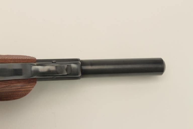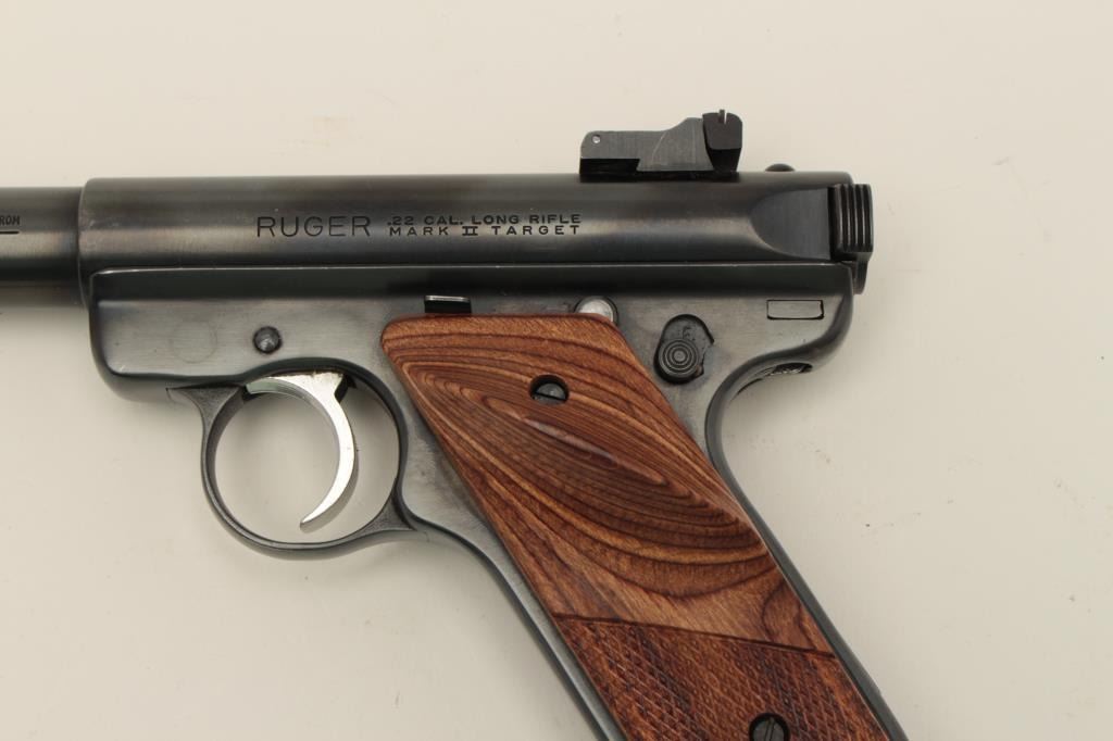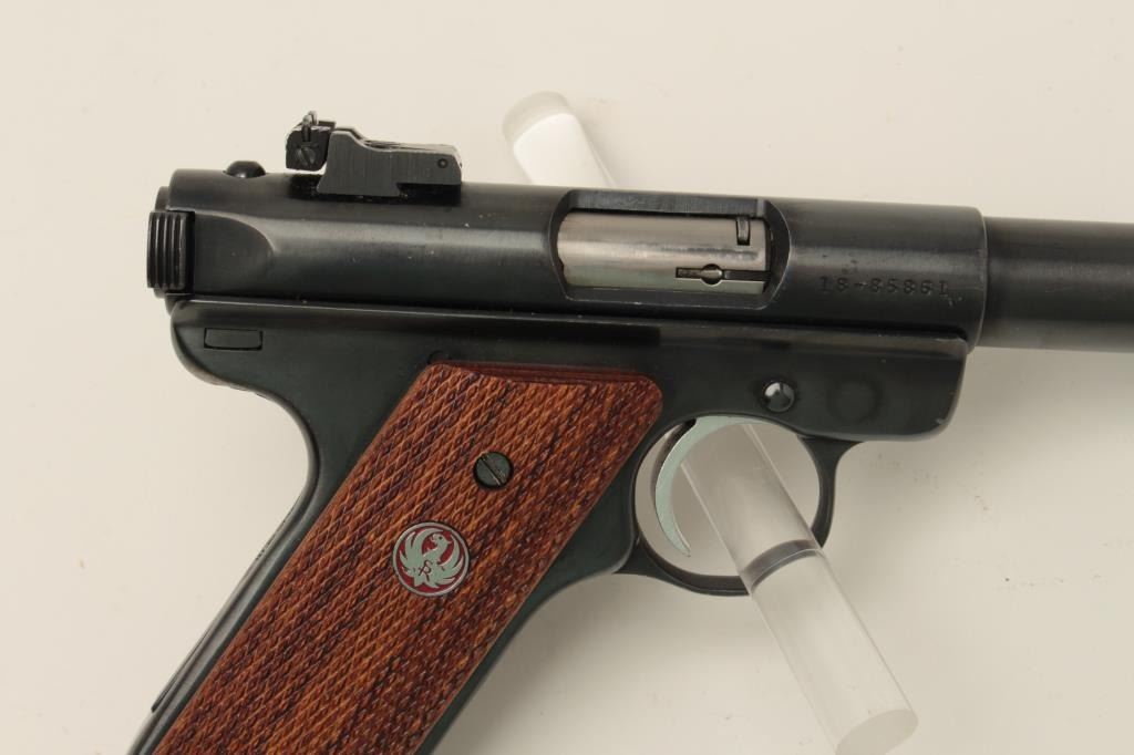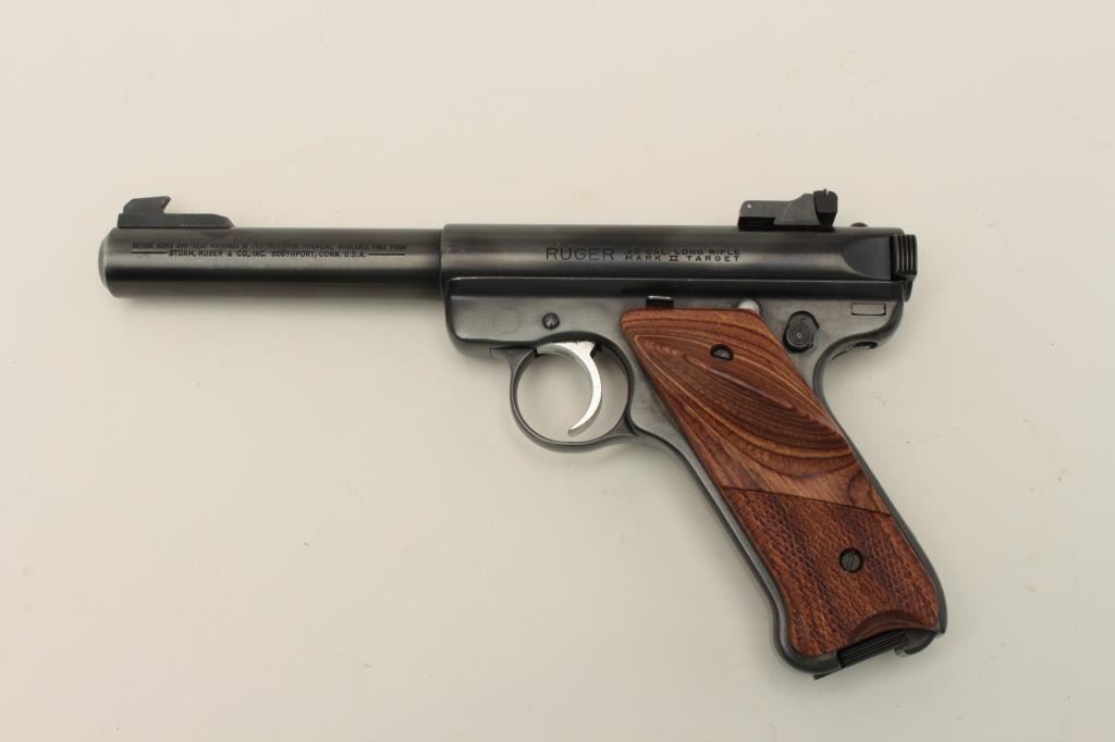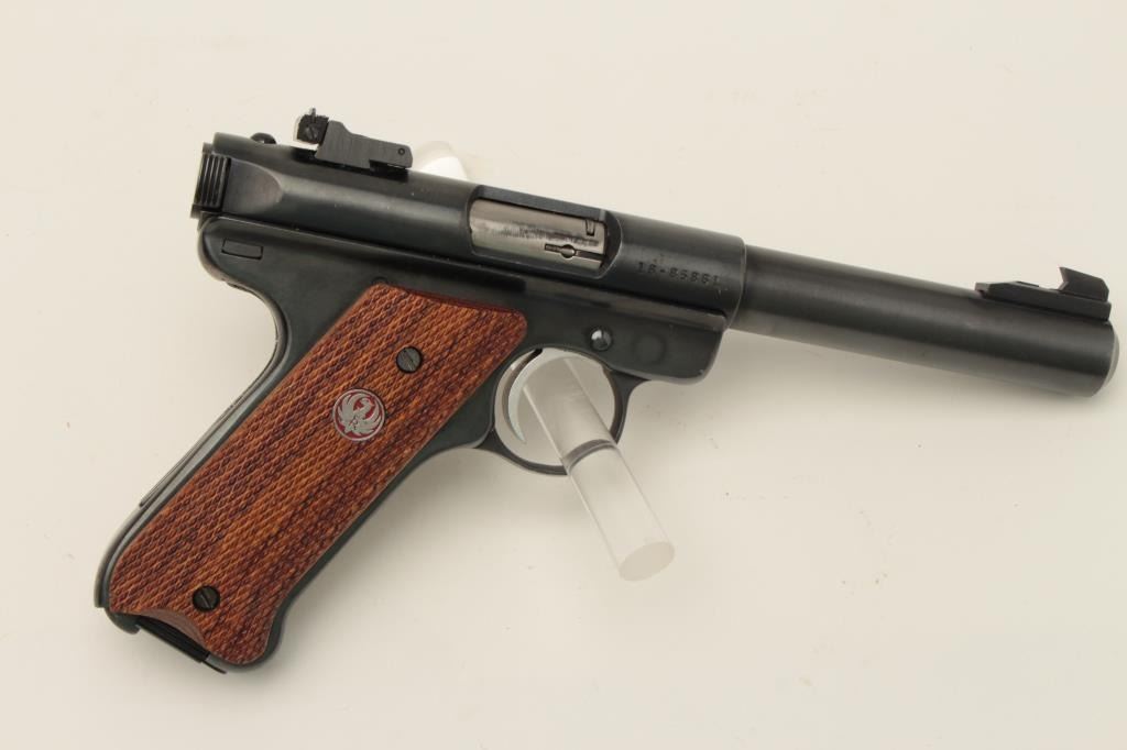 Ruger MK II Target semi-automatic pistol, .22LR caliber, 5.5” barrel, blued finish, checkered thumb rest wood grips, S/N 18-85861, accompanied with 2 extra magazines and a padded soft carry case. The gun is inoverall fine condition with the majority of its original finish, fine bore, action, markings and grips. (Modern/PPT). Est.: $250-$500.