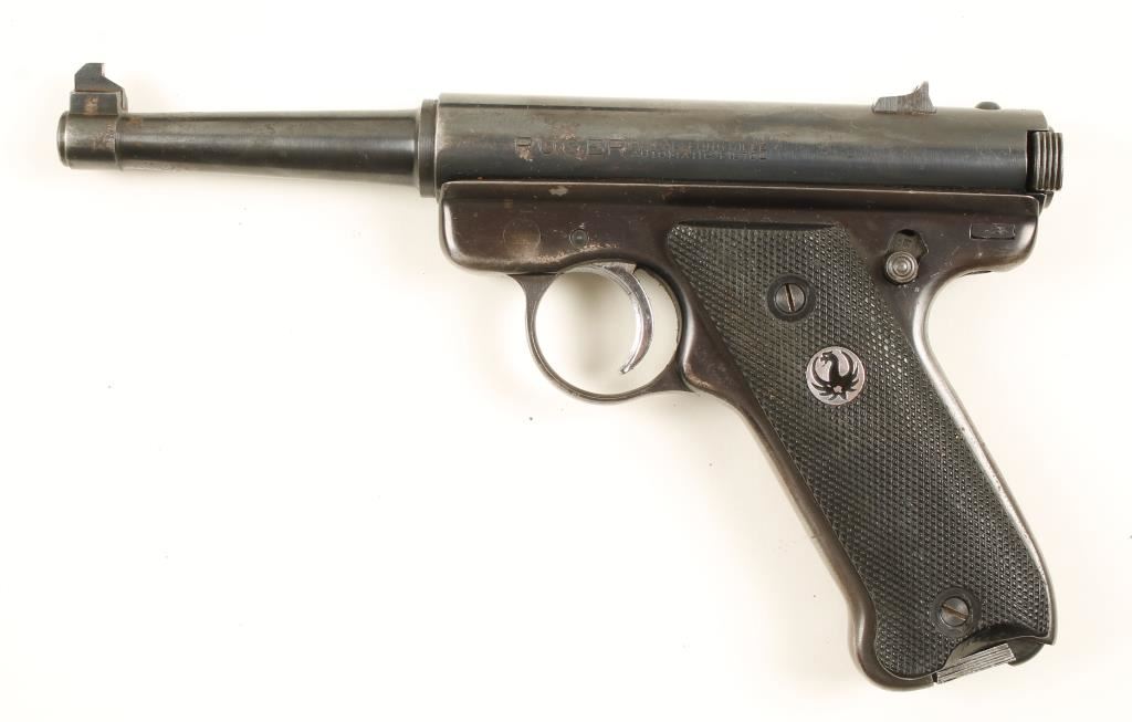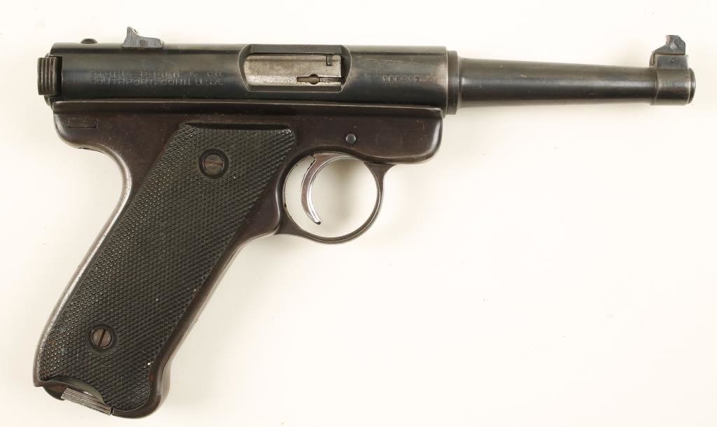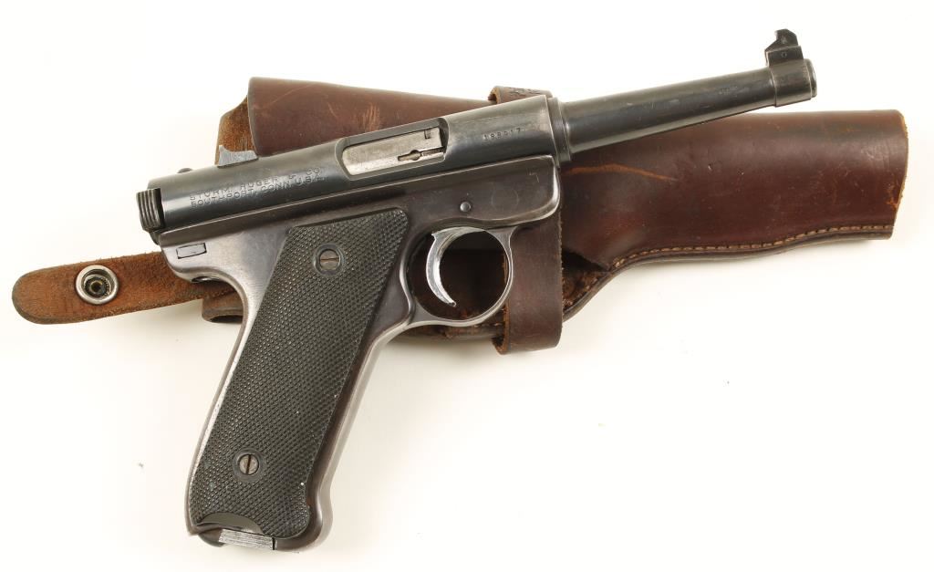 Blued single-action semi-automatic pistol with a 4-3/4" barrel, holster and one magazine. Fixed sights. Finish is worn with edge wear and light pin-prick pitting in some areas. Bore is mirror bright. Plastic grips have the points of the checkering worn down. Action works well. Condition is fair to good. *Modern Firearm*