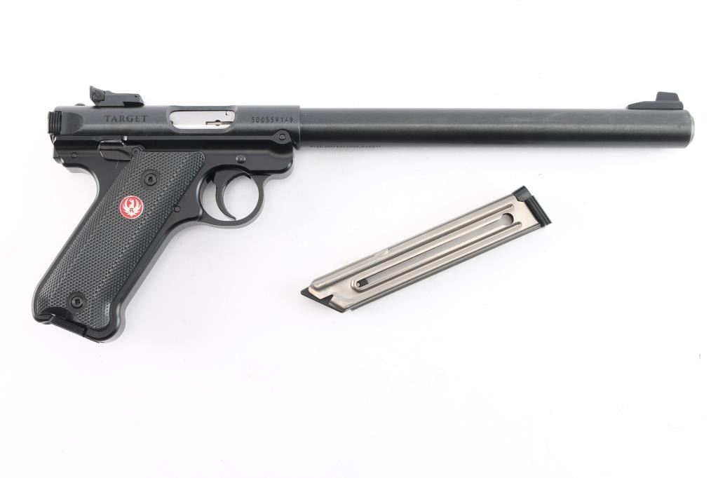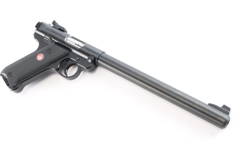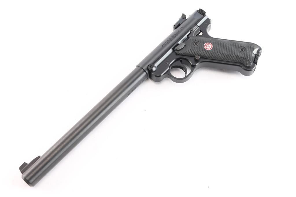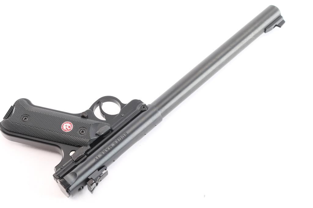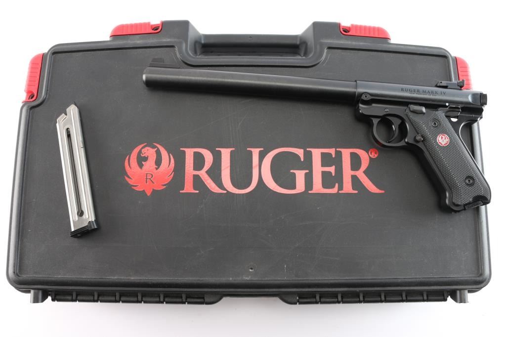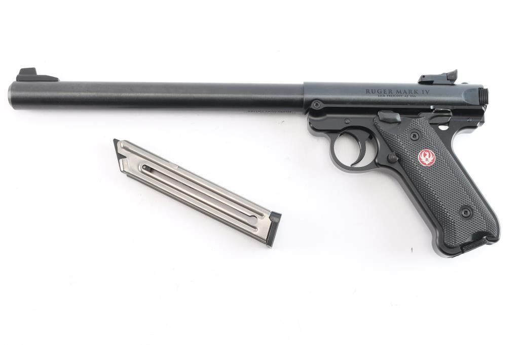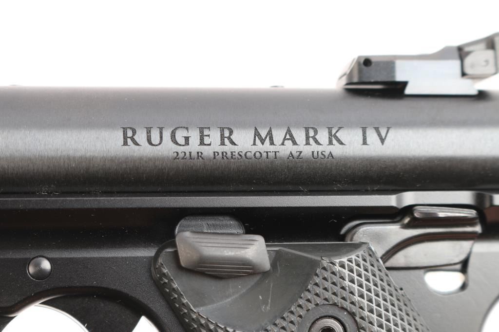 An updated version of an American classic, the MKIV 'Target,' a semi-automatic rimfire pistol chambered for .22 Long rifle. Pistol was manufactured circa 2023 in Prescott, AZ. Featuring a matte blued finish, a 10" round cold-hammer-forged barrel with recessed crown, raised serrated blade front sight, micrometer adjustable serrated notched rear sight, receiver drilled and tapped for optic mounting, serrated curved trigger, serrated cocking knob, push-button take-down at the rear of the frame, smooth grip straps, serrated ambidextrous manual safety (can be converted to left side only with included washer), magazine disconnect, annular cut push-button magazine release, serrated slide stop, and checkered two-piece black plastic grips with silver and red Ruger medallions. The original blued finish retained is approximately 99% with nothing remarkable. Metal displays no rust or deformation. Bore is bright with strong rifling, and the plastic grips are also excellent. The action is smooth and crisp. Pistol includes original foam lined black plastic factory hard case, two magazines total, sticker, safety washer, lock, and paperwork.