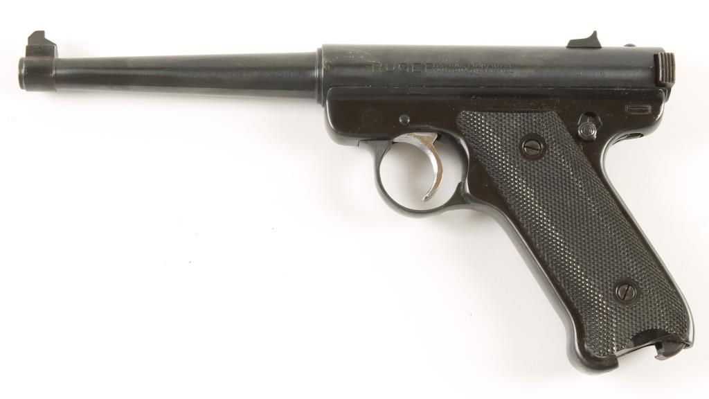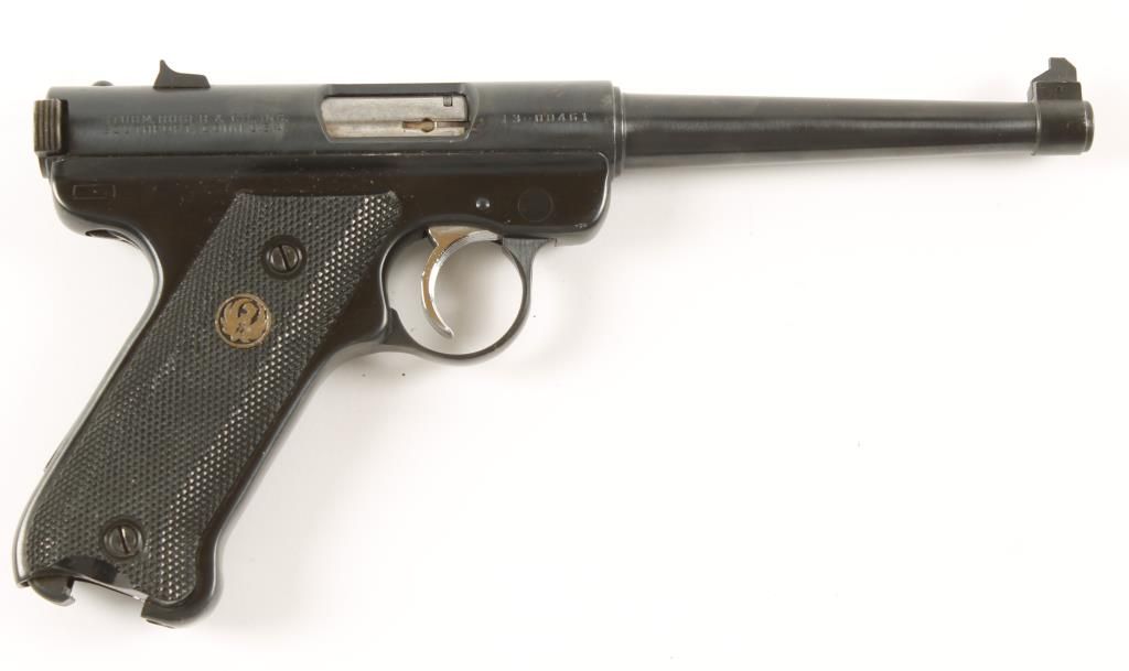 Semi Auto single action blued pistol. 6 inch barrel. Fixed sights. No magazine. Black plastic grips. fixed sights. Condition: Very Good. *Modern Firearm*
