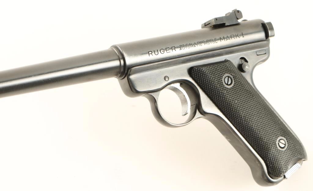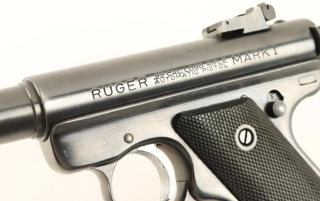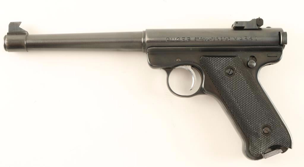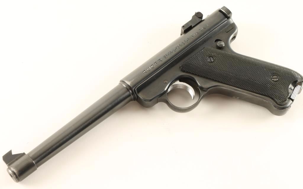 Hammerless semi-automatic target pistol chambered in .22 Long Rifle, circa 1977. Features a blued finish, heavy 7" tapered barrel, large blade front sight, adjustable rear sight, serrated wide trigger, manual safety, 10 round magazine and checkered black plastic grips with Ruger medallion in right grip panel. Pistol shows moderated edge wear with 90% bluing intact. Action is smooth, bore is excellent and grips are good & very good. Condition is very good. ***Modern Firearm***
