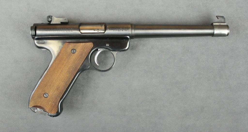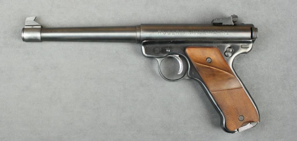 Ruger Mark I semi-auto target pistol, .22LR  cal., 7” round barrel, black finish,  checkered thumb rest wood grips, #10-67473.  This gun is in overall excellent condition  showing approx. 96% original finish, finebore, crisp action, sharp markings, excellent  wood grips.  Est.:  $150-$300.