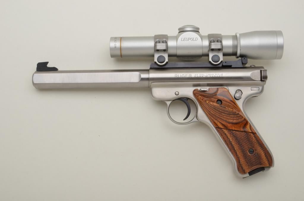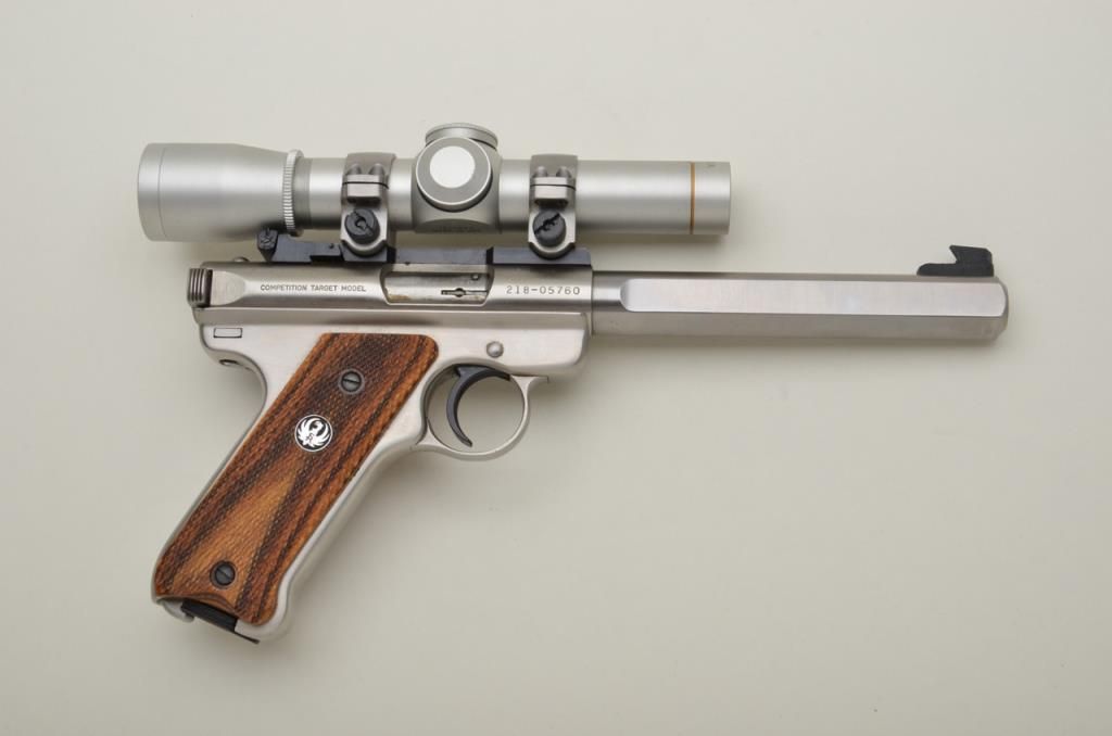 Ruger Mark II Competition Target Model semi-auto pistol, .22LR cal., 7” “slab” barrel, stainless, checkered wood medallion grips, #218-05760, mounted with a Leupold M8-2X Extended E.R. scope in overall fine condition with a fine bore, crisp action, fine grips and sharp optics. Est.: $350-$700.