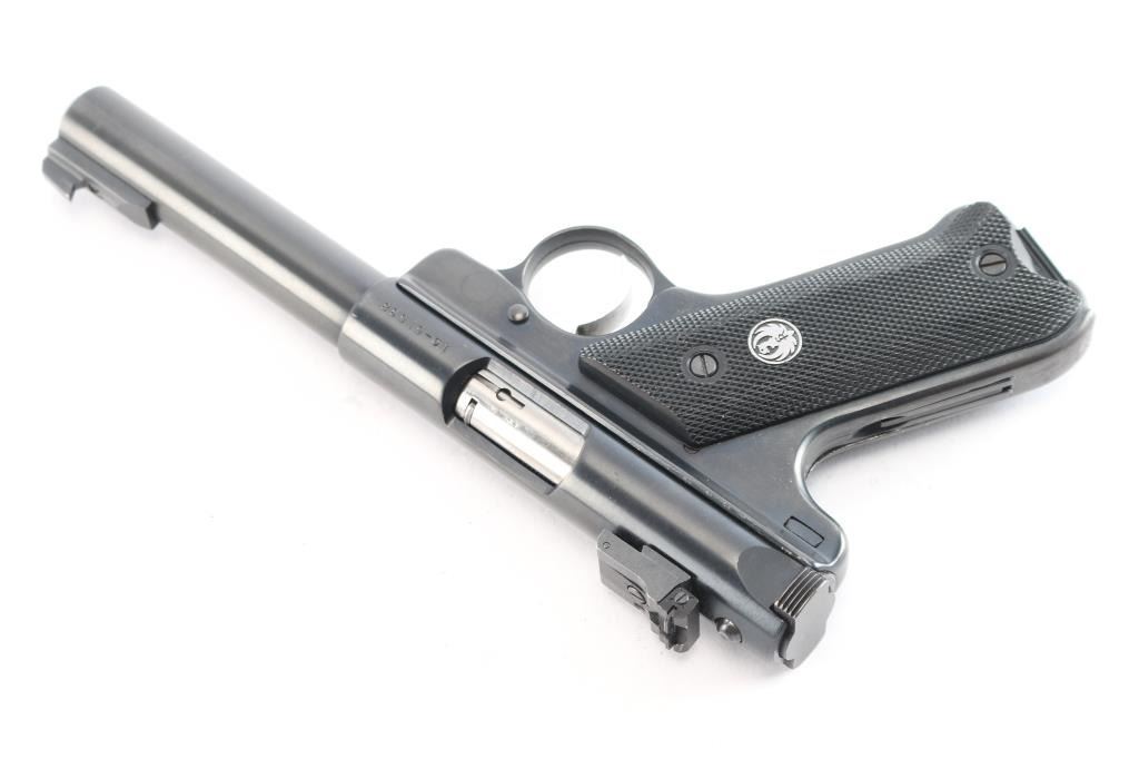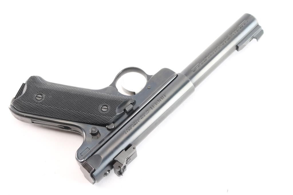 American made semi-automatic target pistol chambered in .22 Long Rifle, circa 1984. Features a blued finish, 6.875" bull barrel, patridge front sight, micro-adjustable rear target sight, steel frame, serrated target trigger, manual safety, factory 10 round magazine and checkered plastic grips with silver/black Ruger Medallion on right panel. Pistol exhibits approximately 98% of it's original blued finish showing a couple minor scratches. Action is strong, bore is excellent and grips are excellent. This pistol has not seen a lot of use. Comes with manual.