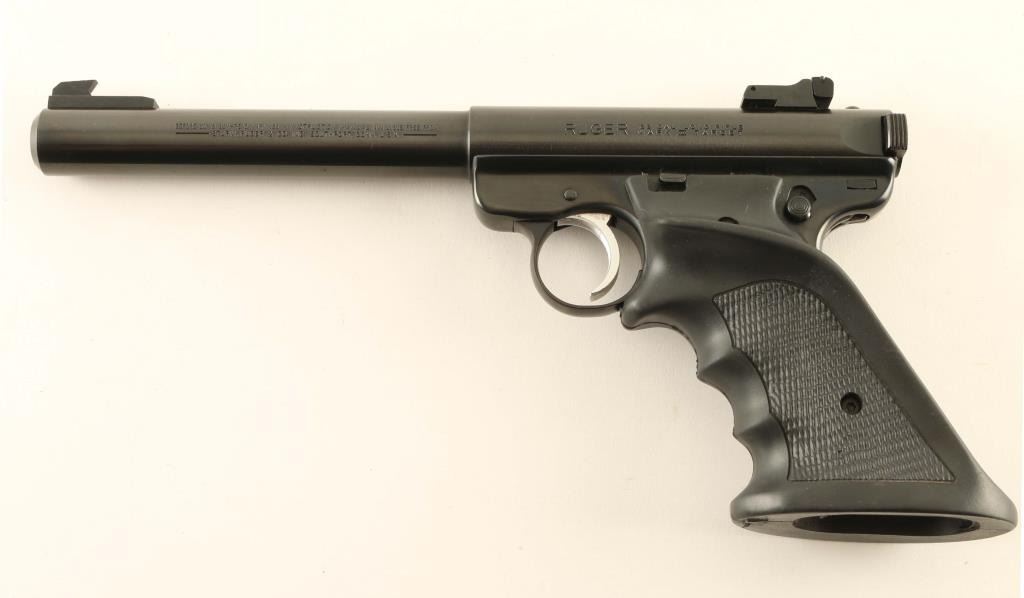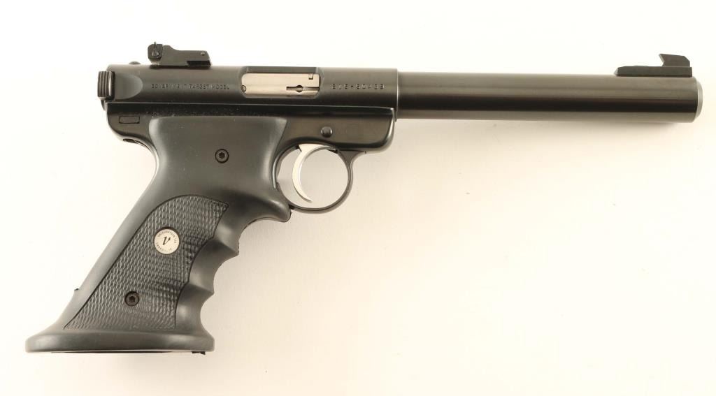 'Government Target Model' Blowback-operated single action semi-automatic target pistol chambered in .22 Long Rifle, manufactured in Southport, CT circa 1989. Features a blued finish, 6 7/8" heavy barrel, undercut patridge front sight, dovetailed fully-adjustable rear sight, serrated wide trigger, concealed hammer, manual safety on the left side of the frame, bolt catch lever on the left side of the frame, heel magazine release, factory 10 round magazine, steel frame and black rubber overmolded Volquartsen target grip with thumb rest on the left side. Pistol retains approximately 98% of its original finish showing light scattered handling marks/wear. Action is smooth, the bore is pristine and the synthetic grip is fine. Condition is NRA Excellent. ***Modern Firearm***