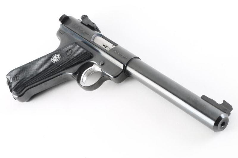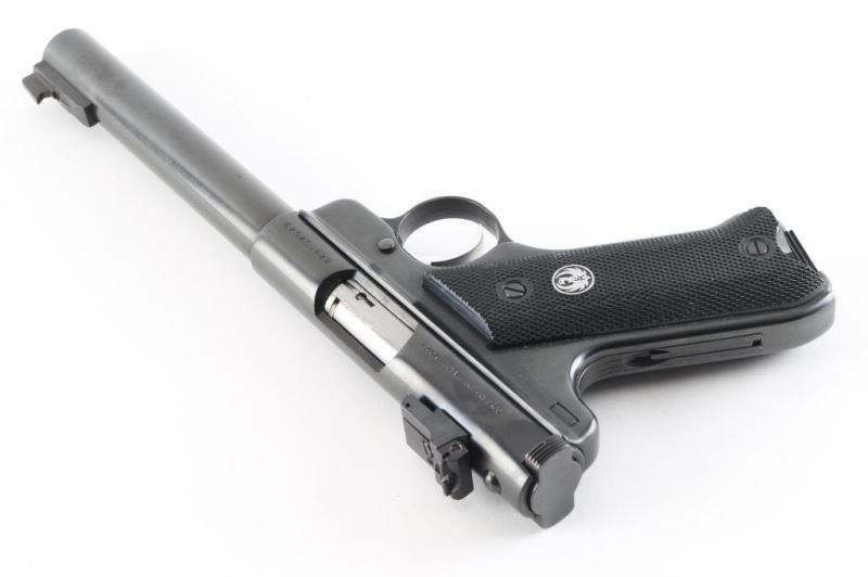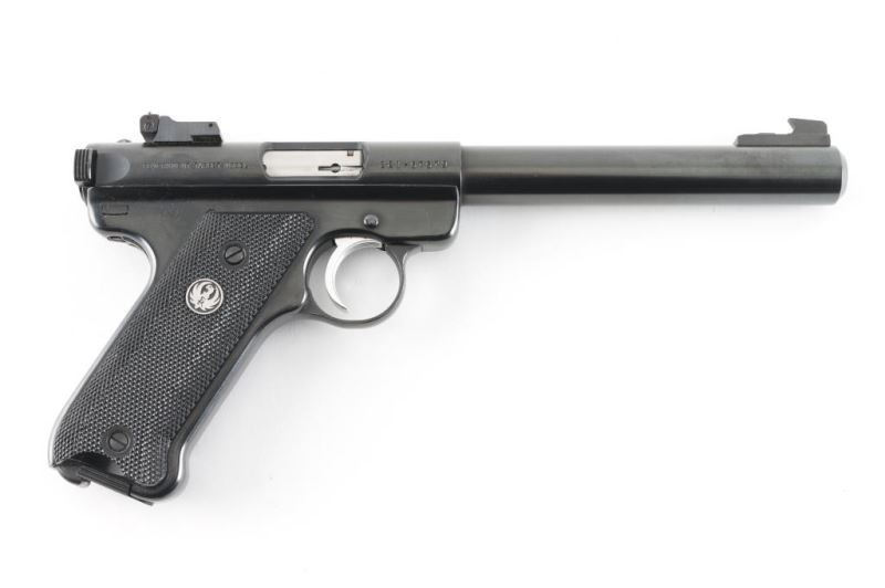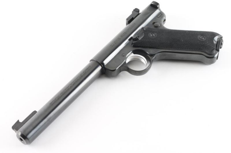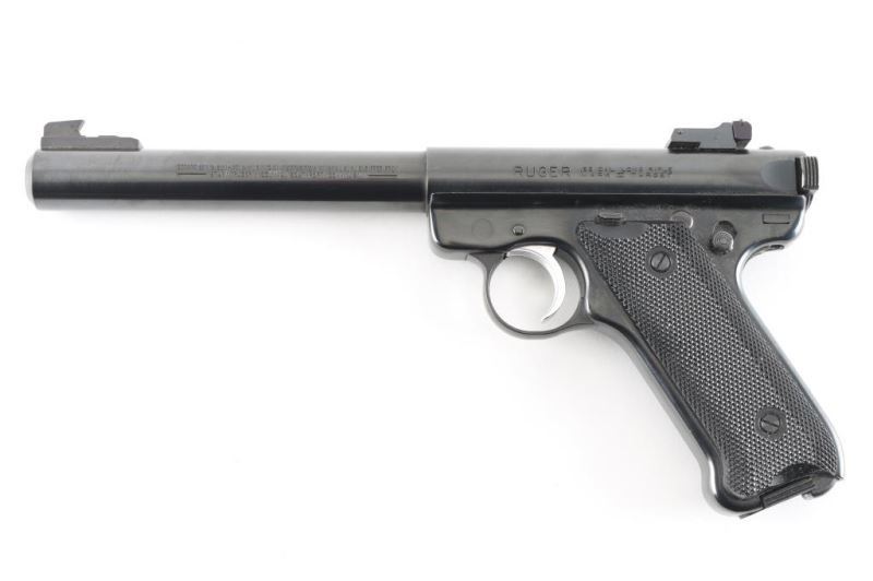 "Government Target Model"Single-action semi-automatic target pistol chambered in .22 Long Rifle, circa 1995. Features a blued finish, 6.875" bull barrel, patridge front sight, adjustable rear target sight, steel frame, serrated target trigger, manual safety, factory 10 round magazine and checkered plastic grips with Ruger Medallions. Pistol exhibits approximately 98% of it's original blued finish showing a couple minor scratches. Action is strong, bore is excellent and grips are excellent. This pistol has not seen a lot of use. Condition is excellent. Modern Firearm.
