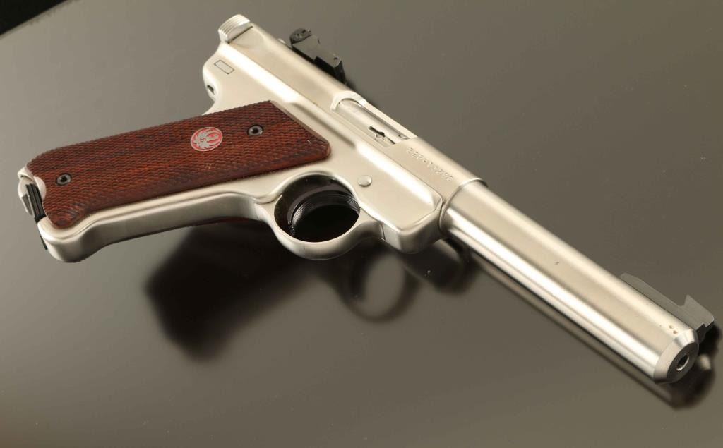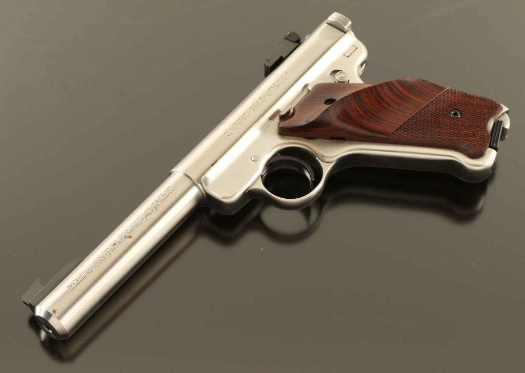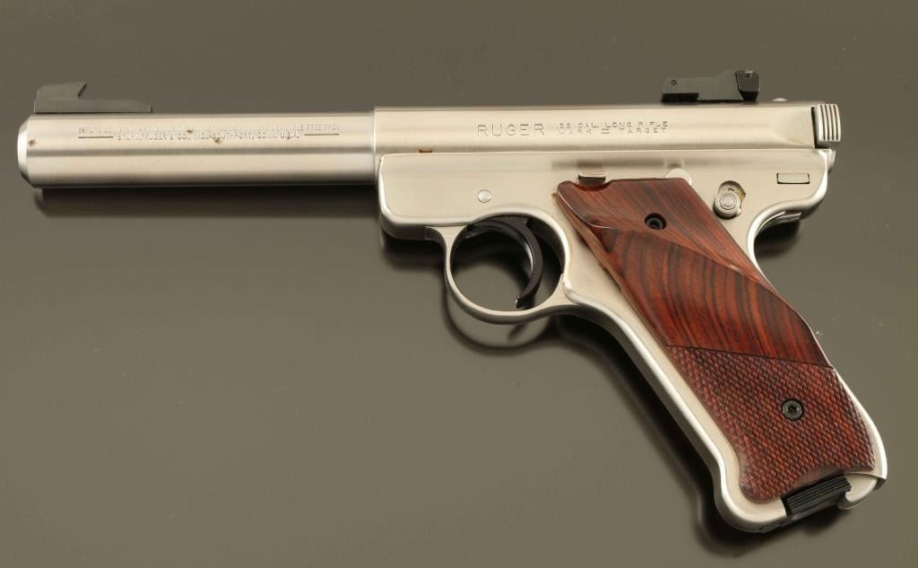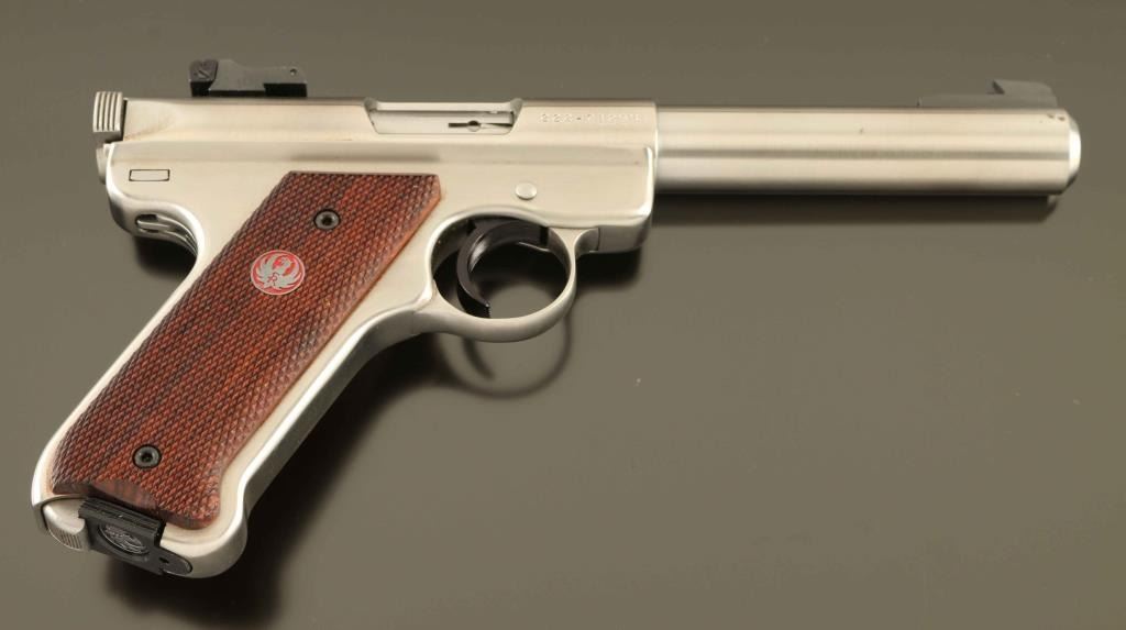 Stainless steel blowback operated semi-automatic target pistol chambered in .22 Long Rifle, manufactured circa 1999. Features a satin stainless finish, 5 1/2" bull barrel, raised patridge front sight, dovetailed adjustable rear sight, serrated wide trigger, bolt hold-open lever, thumb safety on the left side of the frame, heel magazine release, 10 round factory magazine, and two-piece checkered wood target grips with thumb rest on the left panel & red Ruger medallion on the right. Pistol exhibits light handling wear and has a few small spots of scattered light surface rust on the barrel. Action is crisp, the bore is excellent and the wood grips are fine. Condition is near NRA Very Good. ***Modern Firearm***