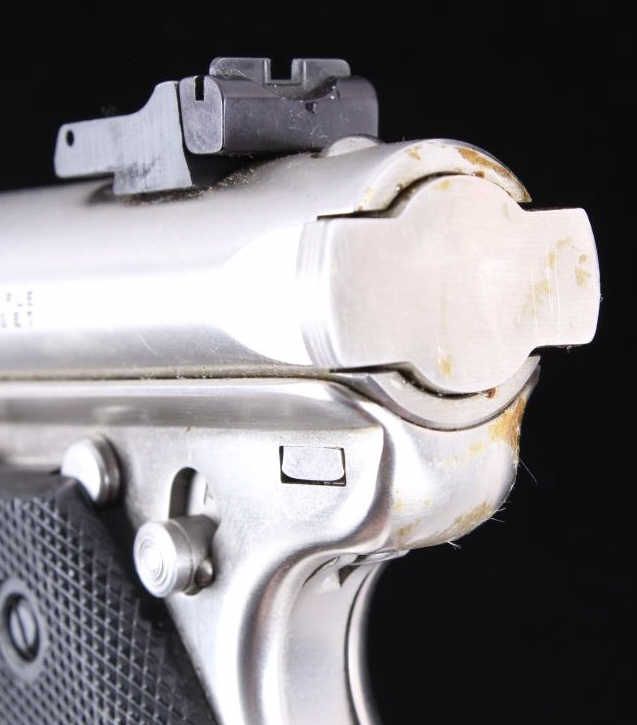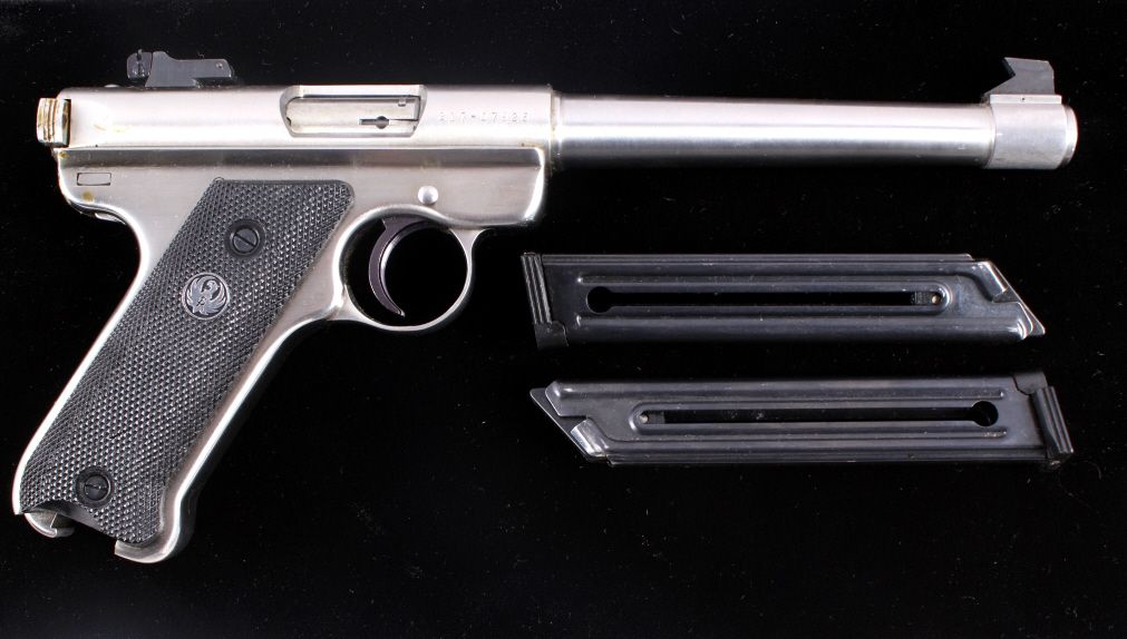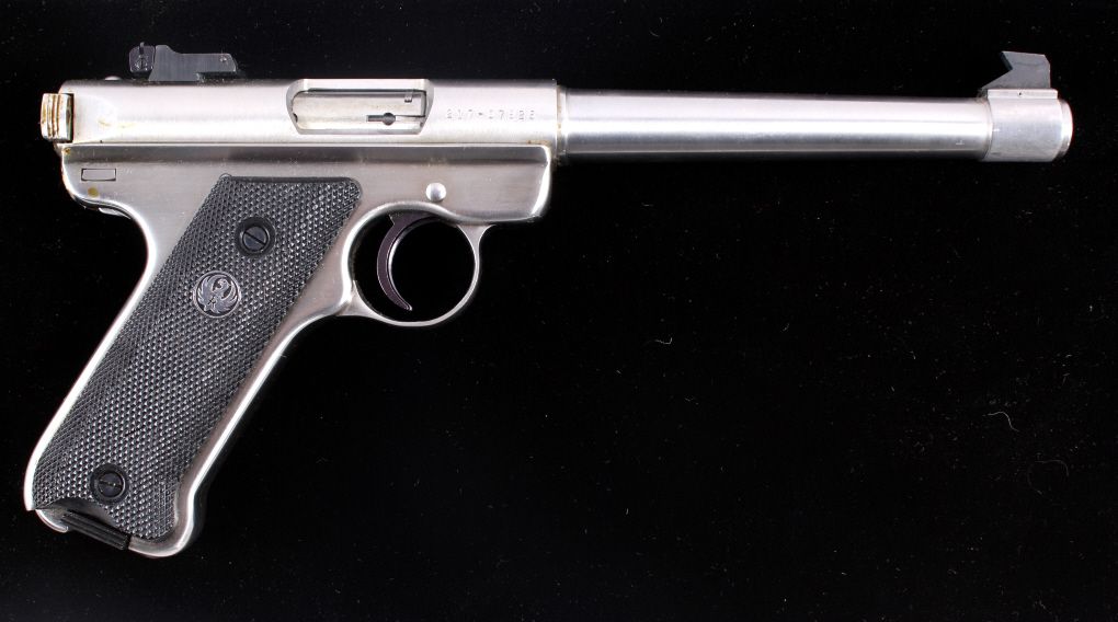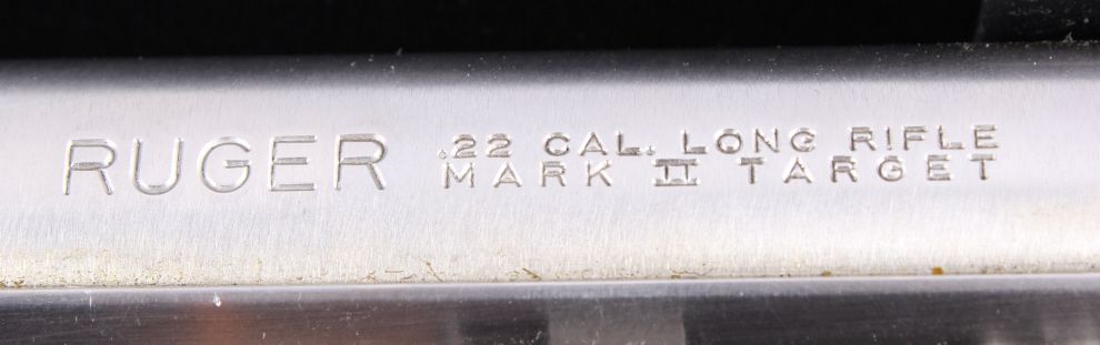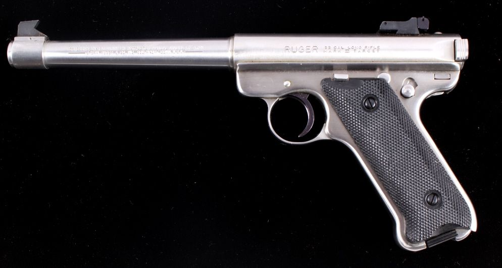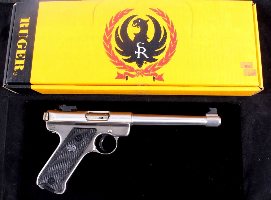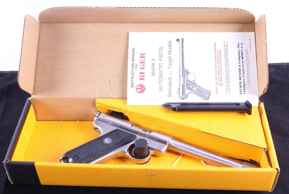 This is a Sturm, Ruger & Co. Mark II Target Pistol. The pistol is in .22 Long Rifle caliber with a stainless steel finish. The hand gun comes in the original box, 6 7/8" Bbl., and two clip. Serial Number 214-07925.