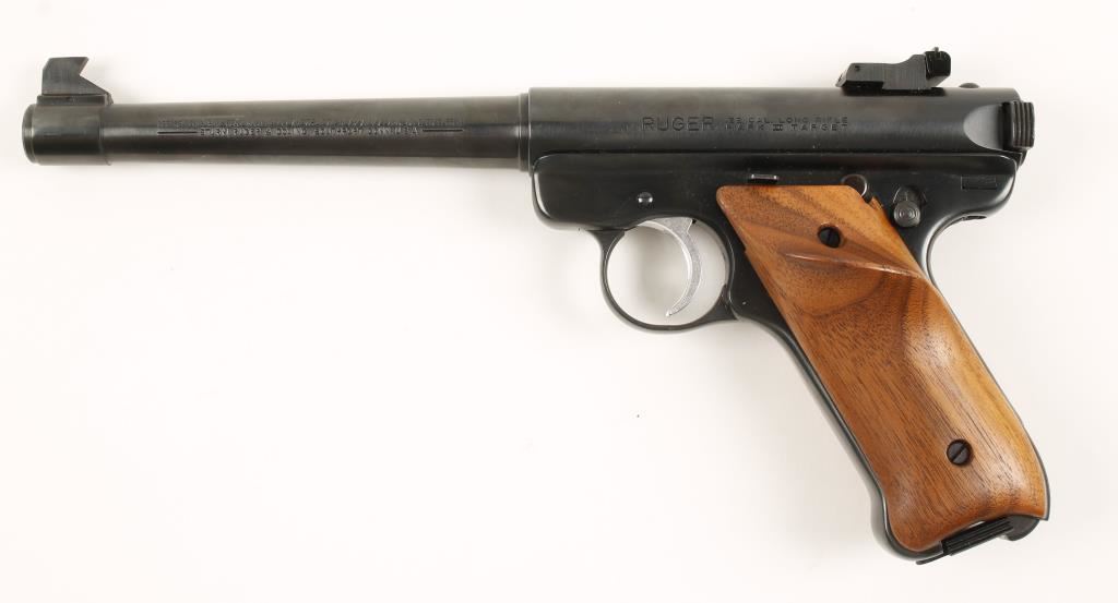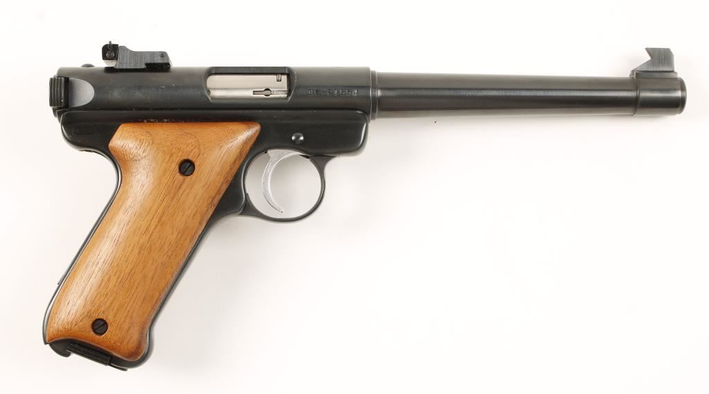 Single Action semi auto Target Pistol. Blued Frame, Barrel Trigger Guard. Stainless Trigger and Bolt. Adjustable Target Sights and brown wooden right handed target grips. 7" inch round Barrel. European Magazine Release at Bottom of Grip. One 10 round single stack factory magazine. Condition is Excellent. *Modern Firearm*