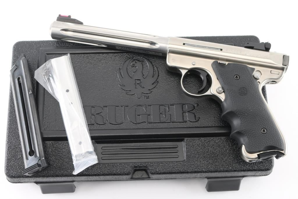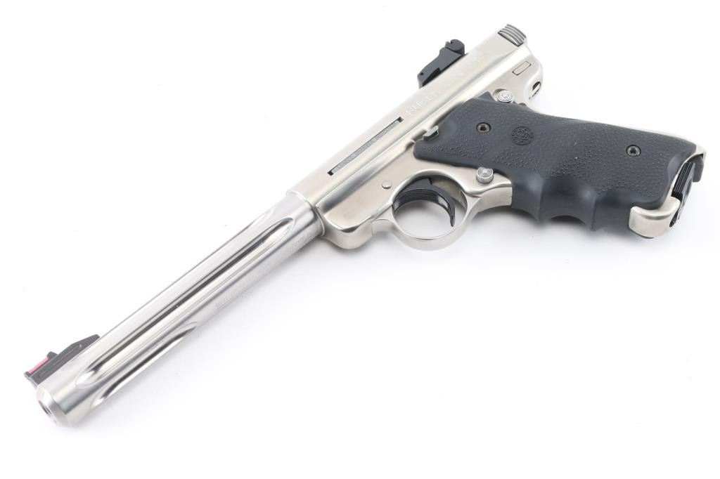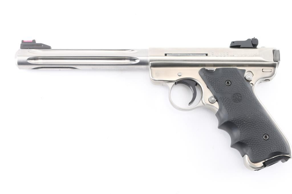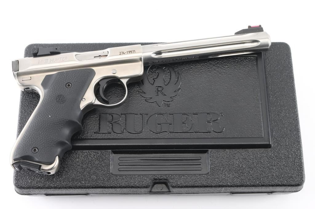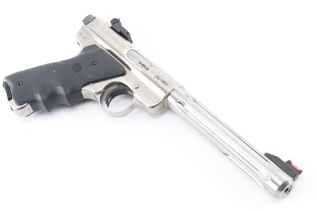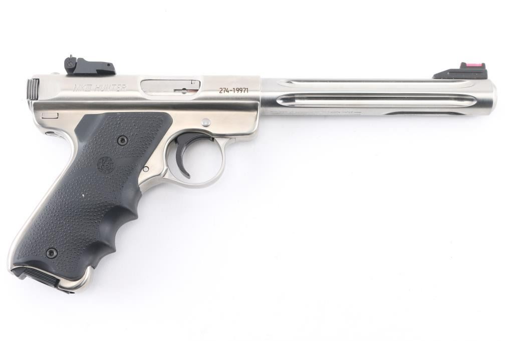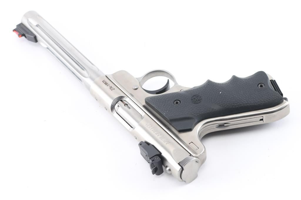 Rare MARK III HUNTER Blowback operated single action semi-automatic target pistol chambered in .22 Long Rifle, manufactured circa 2014. Features a stainless steel finish, stainless steel 6.88" fluted heavy barrel with recessed crown, raised red optic front sight, adjustable rear sight, wide serrated trigger, loaded chamber indicator, thumb safety on the left side of the frame, internal locking safety, cocking serrations on the bolt, push button magazine release, factory 10 round magazine, and checkered, pebbled, black rubber Hogue grip with finger grooves. Includes the original factory black plastic hard case with key, manual, spent case, lock, factory scope rail, green and red inserts for optic sights and spare magazine. Pistol is new in box condition.