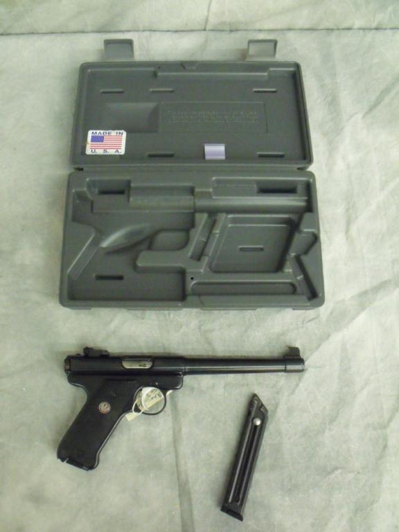 Ruger Mark III 22 caliber semi automatic pistol, serial number 227-10153, includes case and extra clip.