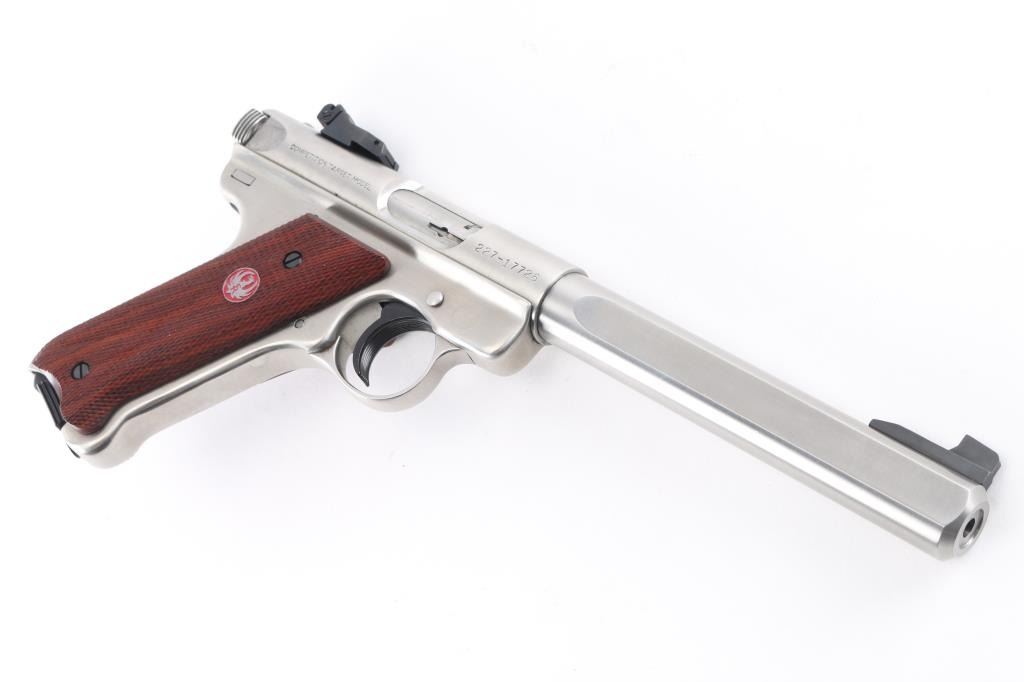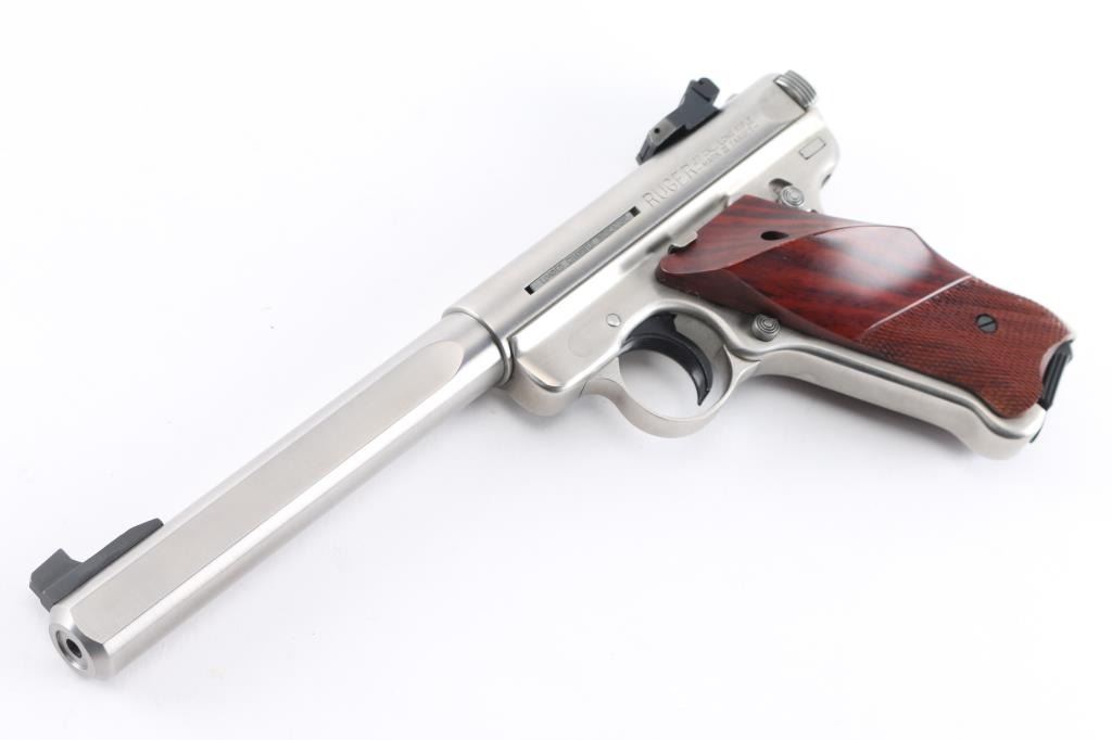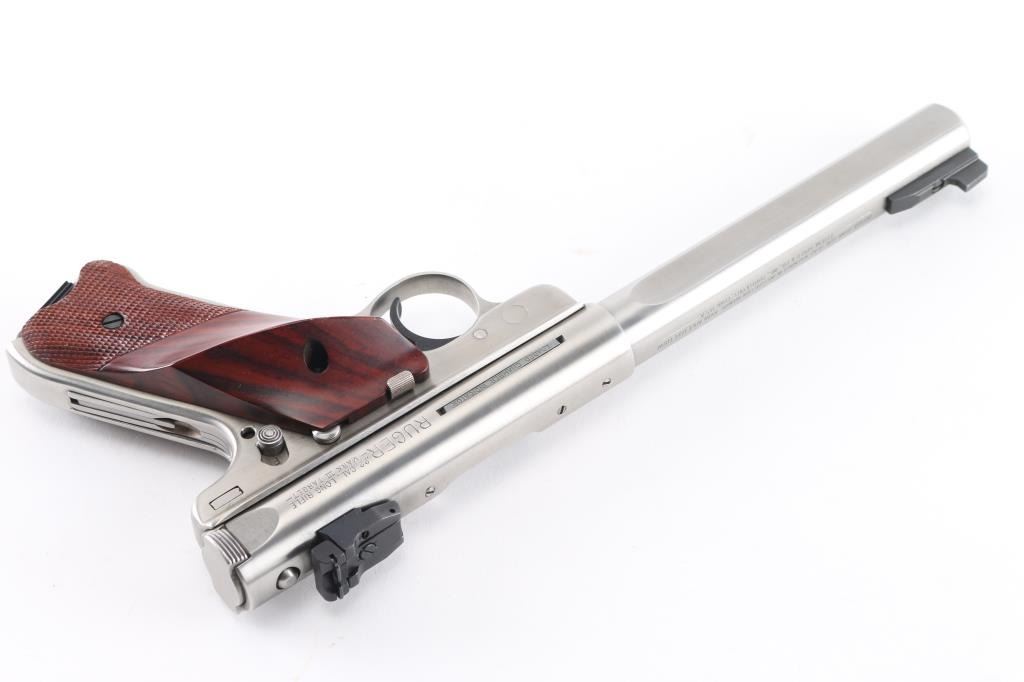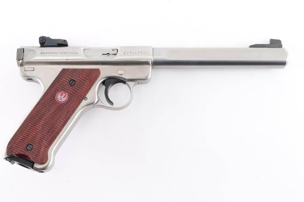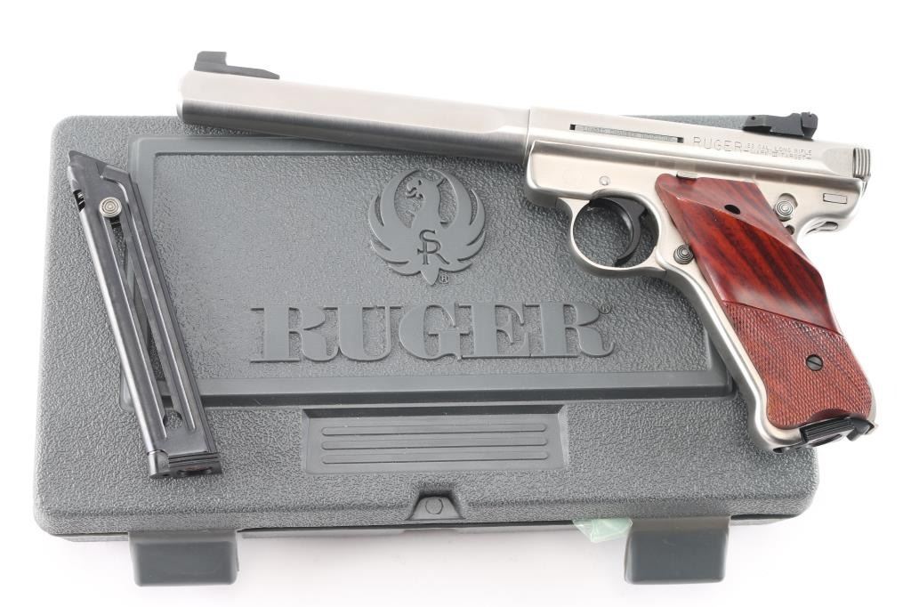 Competition Target Model. Blowback operated single action semi-automatic target pistol chambered in .22 Long Rifle, manufactured circa 2005. Features a brushed finish, stainless steel 6.3/4" slab-side heavy barrel with recessed crown, raised patridge front sight, adjustable rear sight, wide serrated trigger, loaded chamber indicator, thumb safety on the left side of the frame, internal locking safety, cocking serrations on the bolt, push button magazine release, factory 10 round magazine, and partially checkered two-piece brown laminated wood grips with thumb rest on the left panel & red Ruger medallion on the right. Includes the original factory grey plastic hard case with keys, manual, spent case, lock and spare magazine. Pistol exhibits only a few light handling marks with no major wear observed. Action is smooth, bore is pristine, and wood grips are fine.Condition is near NRA Perfect in case. Modern Firearm.