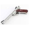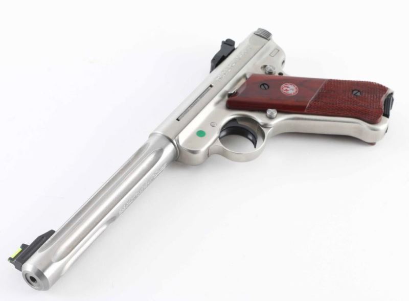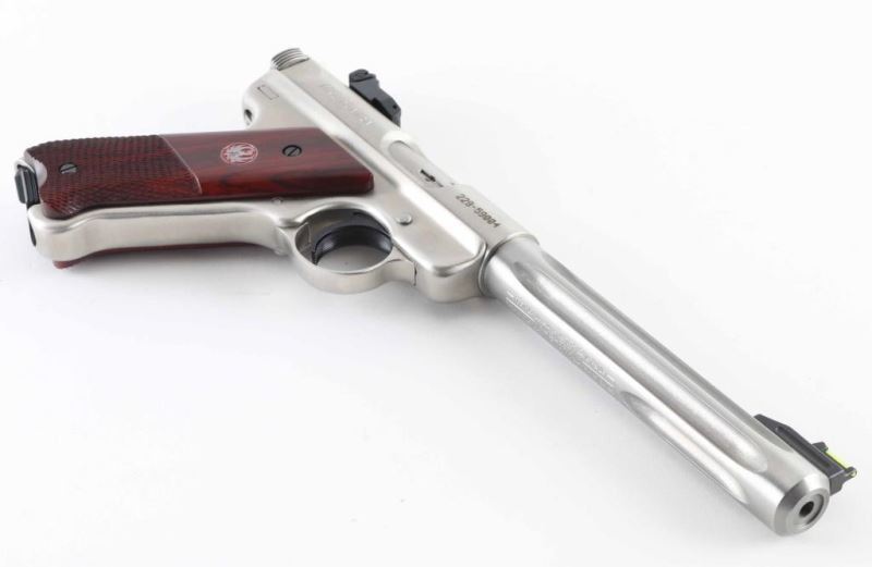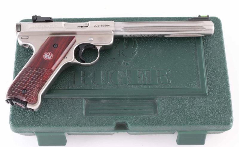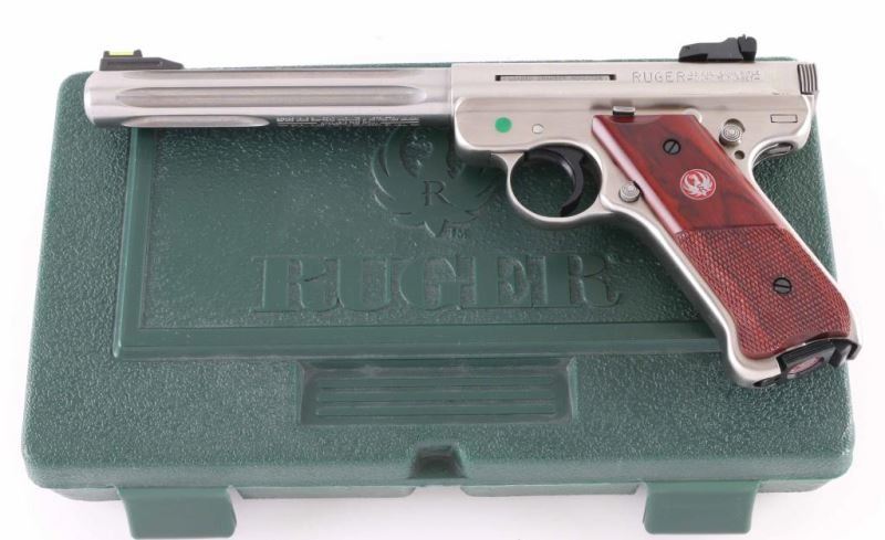Stainless steel single action semi-automatic target pistol chambered in .22 Long Rifle. Features a brushed finish, 6.75" fluted bull barrel, raised patridge front sight with fiber optic insert, fully-adjustable rear sight, factory drilled & tapped receiver, serrated wide trigger, concealed hammer, thumb safety on the left side of the frame, internal locking safety, loaded chamber indicator, serrated cocking tabs on the rear of the bolt, bolt catch on the left side of the frame, push button magazine release, factory 10 round magazine, two-piece fancy wood grips (checkered on bottom half) with inlayed red/silver Ruger medallions. Bore is very good condition. Overall condition is near new with few signs of use and handling. Includes the original factory green plastic hard case with manual, selection of different front sight inserts. Condition is NRA Excellent *** Modern Firearm ***