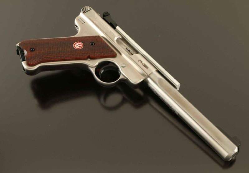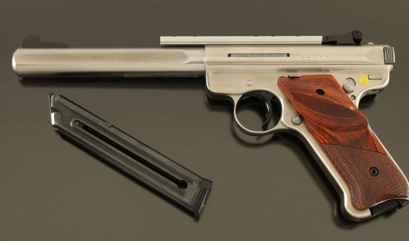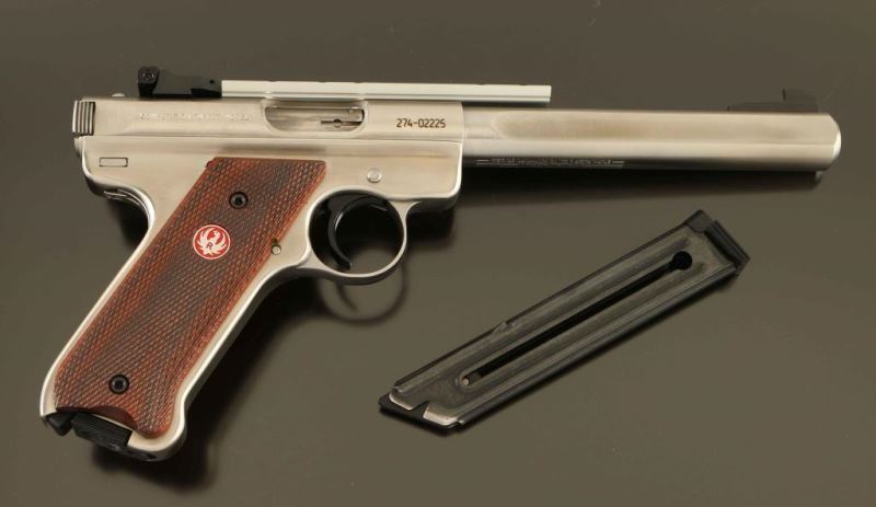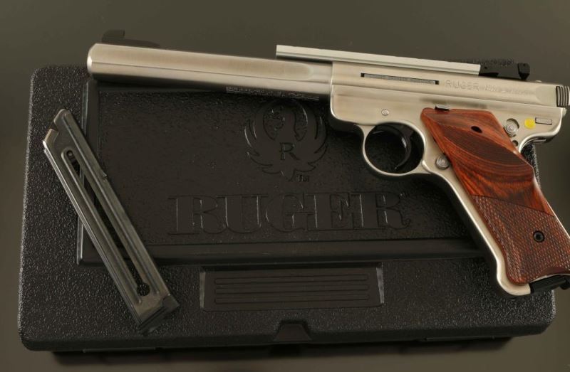 'Competition Target Model' Blowback operated single action semi-automatic target pistol chambered in .22 Long Rifle, manufactured circa 2013. Features a brushed finish, stainless steel 6.88" slab-side heavy barrel with recessed crown, raised patridge front sight, adjustable rear sight, installed factory scope rail, wide serrated trigger, loaded chamber indicator, thumb safety on the left side of the frame, internal locking safety, cocking serrations on the bolt, push button magazine release, factory 10 round magazine, and partially checkered two-piece brown laminated wood grips with thumb rest on the left panel & red Ruger medallion on the right. Includes the original factory black plastic hard case with key, manual, spent case, lock and spare magazine. Pistol exhibits only a few light handling marks with no major wear observed. Action is smooth, bore is pristine, and wood grips are fine. Condition is near NRA Perfect in case. ***Modern Firearm***
