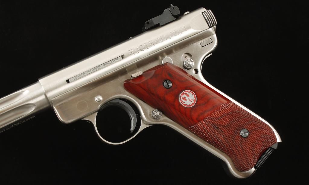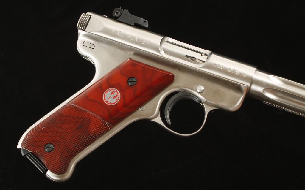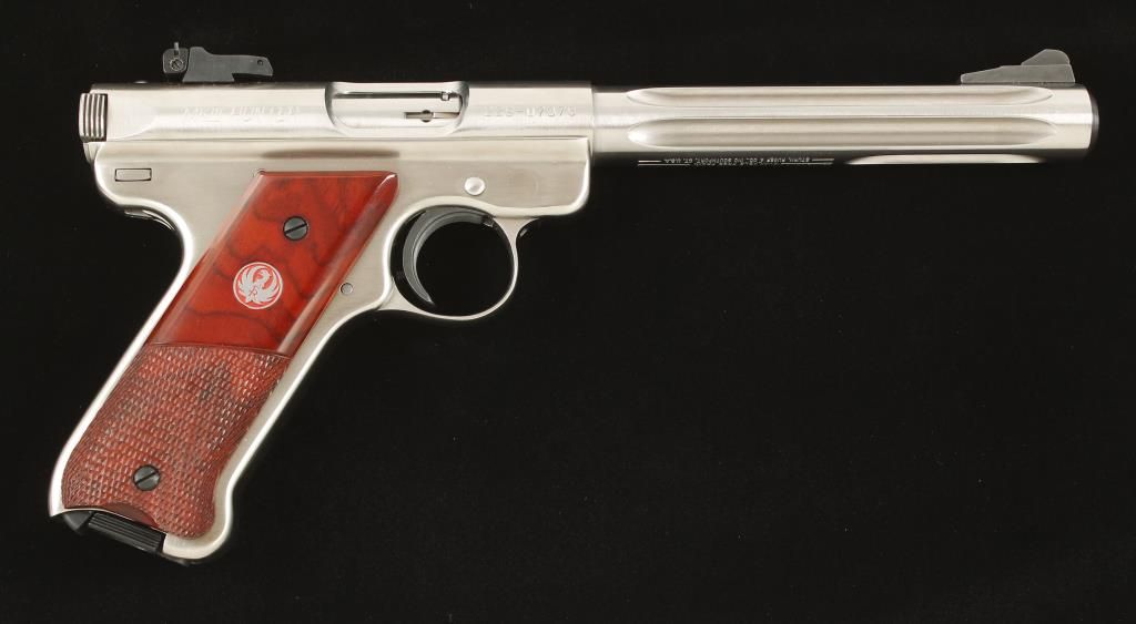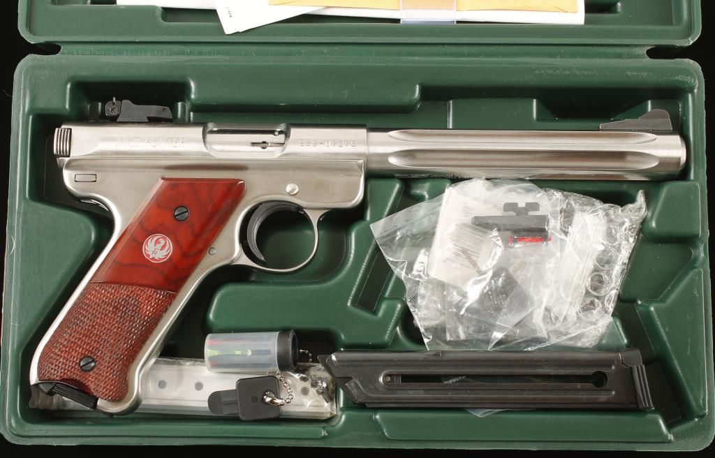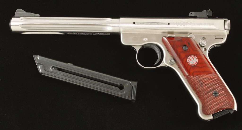 Single action semi automatic stainless steel hammerless pistol. 6-7/8" fluted barrel with bright bore and strong rifling. Adjustable rear sight with orange panel front ramp sight. Trigger is adjustable for over travel. right side of gun is marked "MKIII HUNTER". Grips are half checkered wood with red field griffon medallions. Includes box with extra magazine, extras parts (picatinney rail) fire sight , locks, keys, handbook. Condition: Very good. *Modern Firearm*