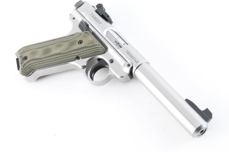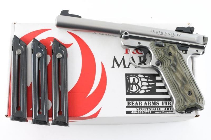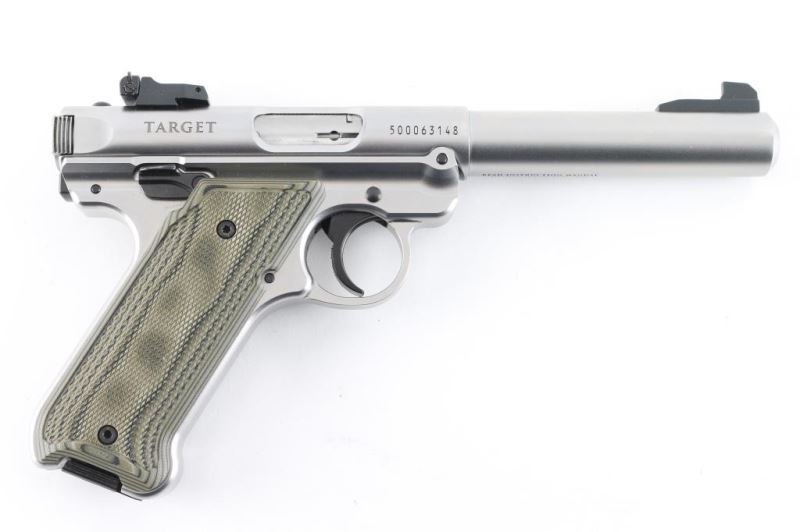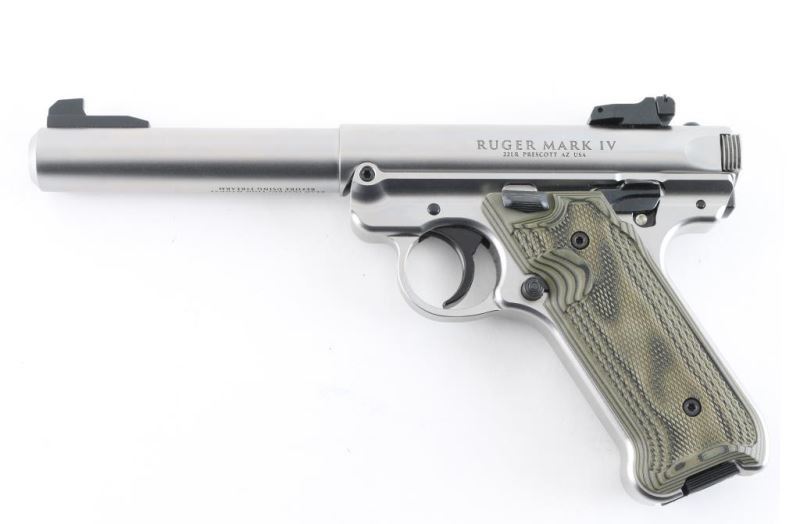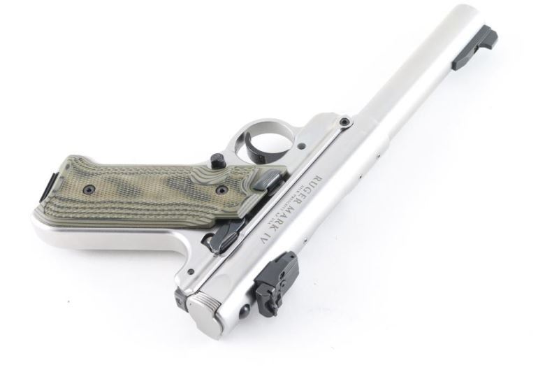 The Ruger Mark IV is American made, stainless steel, semi-auto pistol chambered for .22 LR circa 2018. It offers a simple one-button takedown and features a satin stainless finish, 5.5" bull barrel, a raised fixed front sight and adjustable rear sight with a drilled and tapped receiver for Weaver or Picatinny style rail. It also offers an ambidextrous manual safety and push-button magazine release on the left side of the frame. The 2 piece green G10 grips are a nice addition. Bore looks great, needs cleaned. Comes with original factory box, lock, owners manual, original factory grips and four 10 round magazines. This gun shows very little to no signs of handling or use. Condition is NRA Excellent **Modern Firearm**