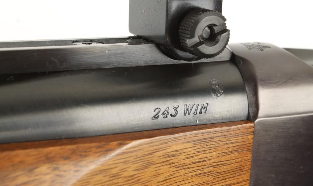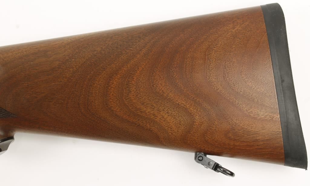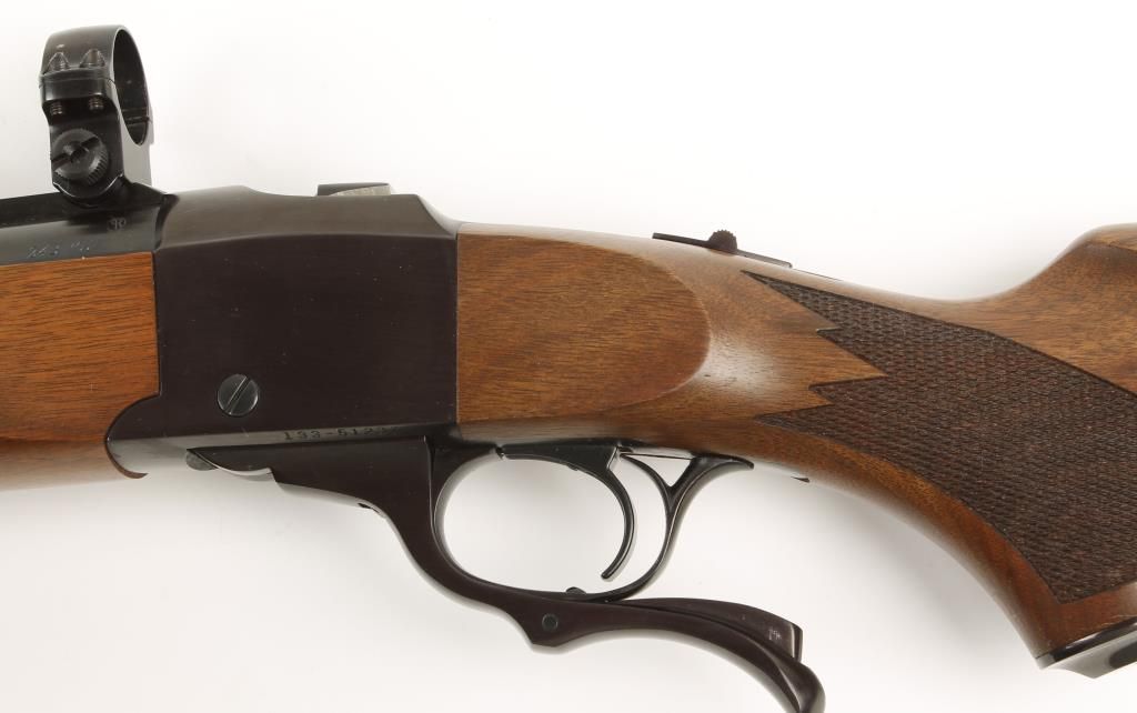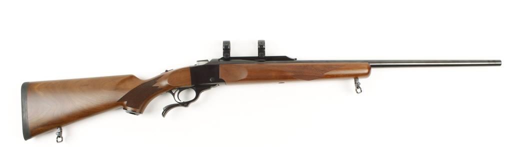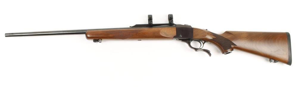 Single shot falling block action rifle with 26" medium barrel. Blued finish, checkered pistol grip walnut stock, semi-beavertail forearm, sling swivels, no sights and includes scope rings. Excellent bore and action. Condition: Excellent.