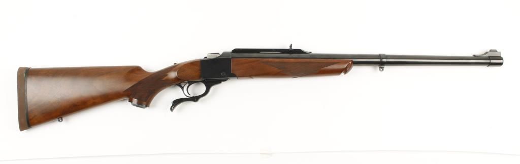 Single shot falling block action large bore rifle with custom 24" barrel. checkered pistol grip walnut stock and forearm, rubber recoil pad, folding rear leaf sight, tang safety and scope rail. Excellent bore and action. Condition: Very good to excellent with butt stock having slight wobble, needs to be tightened.
