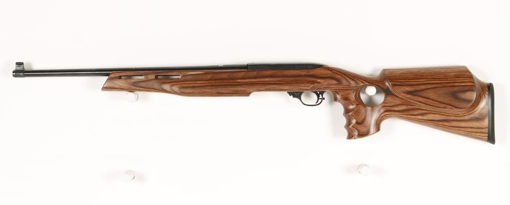 Popular semi auto rimfire rifle with 18" barrel. Blued finish, custom laminated pistol grip thumb hole stock, no rear sight, drill and tapped for scope mounts. Very good bore and action. Includes 1 magazine. Condition: Good showing scratching on top of receiver, wood is excellent. *Modern Firearm*