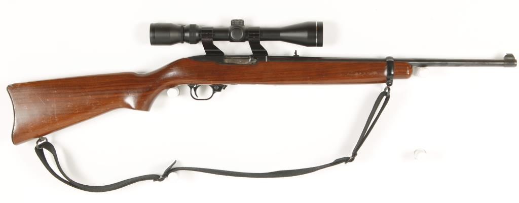 Semi auto para-military style rimfire rifle with 18" barrel. Blued finish, plain pistol grip wood stock, detachable magazine, flip down rear sight and fitted with Tasco 3-9X40 scope on see through mounts. Good bore and action. Includes 1 magazine. Condition: Good showing pockets of light pinpricking and wood shows wear. *Modern Firearm*