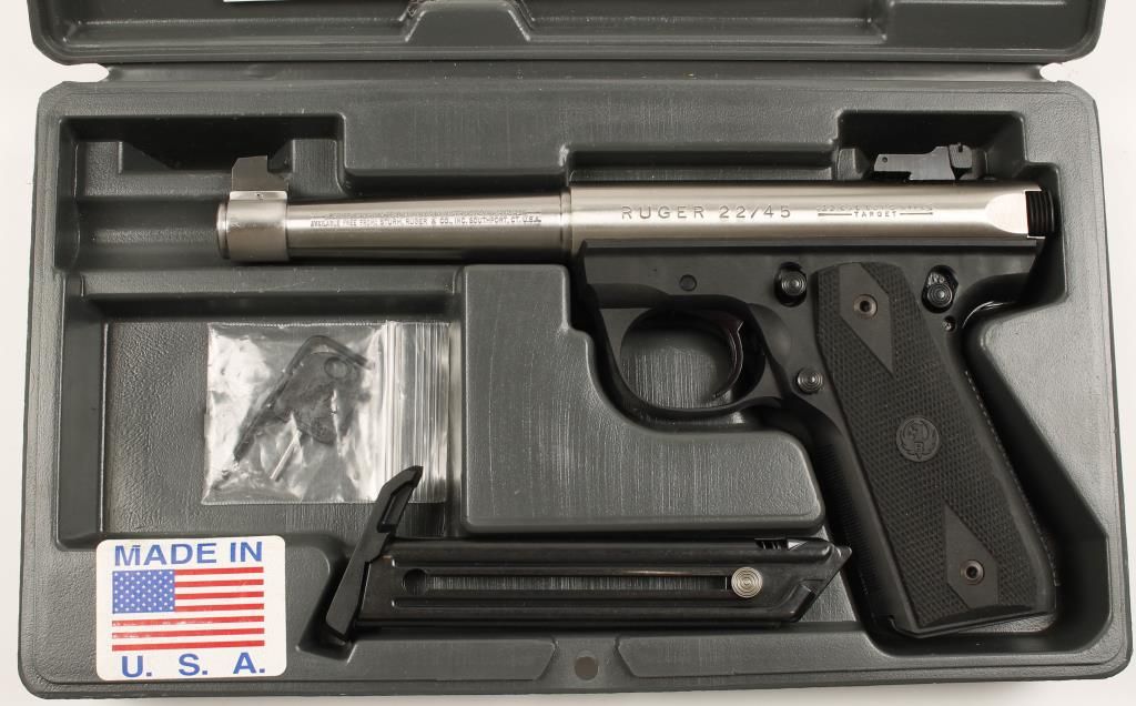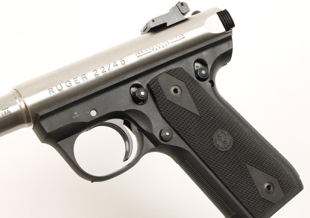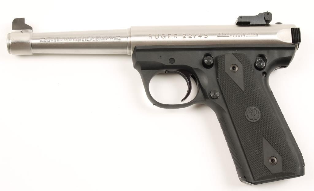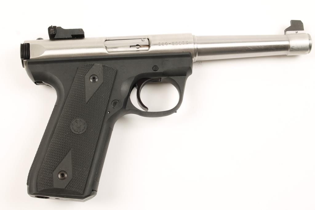 Single action semi auto rimfire pistol with 5-1/4" barrel. Stainless steel barrel and slide, polymer frame, checkered double diamond black rubber grips and adjustable rear sight. Excellent bore and action. Includes original box, manual and 2 magazines. Condition: Excellent showing light handling. *Modern Firearm*