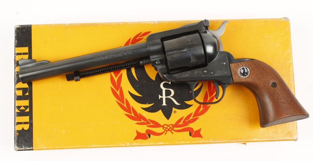 Single action 3 screw revolver with 6-1/2" barrel. Blued finish, smooth walnut grips and adjustable rear sight. Very good bore and action. Includes yellow Ruger box. Condition: Very good showing light scratches on cylinder.