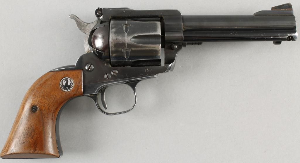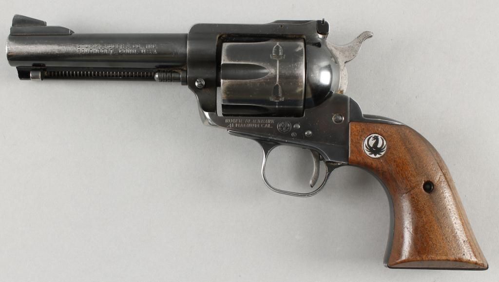 Ruger Mdl Blackhawk Cal .41mag SN:757Single action revolver, 4-5/8" barrel, blue finish with wood g