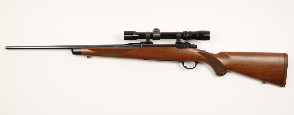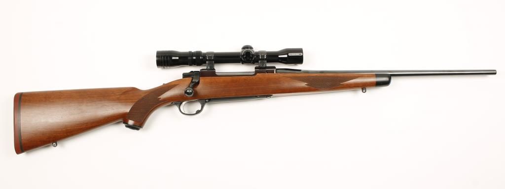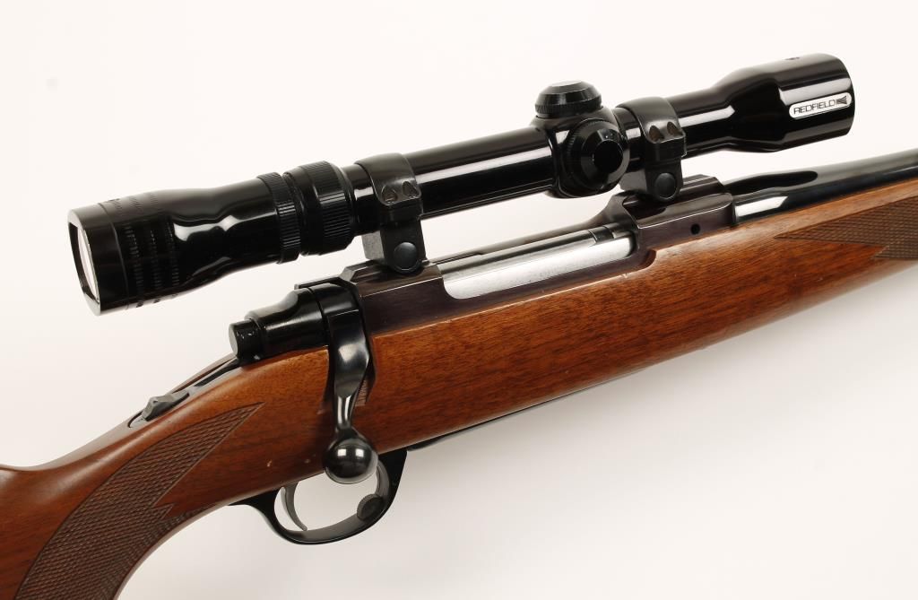 Early model bolt action ultralight sporting rifle with 20" barrel. Blued finish, checkered pistol grip walnut stock with black forend cap, tang safety, no sights and fitted with Redfield Lo-Pro 2-7X scope. Good bore and action. Condition: Very god showing a few small dings and scratches in wood. *modern Firearm*