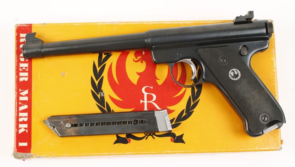 Single action semi auto rimfire pistol with 6-7/8" barrel. Blued finish, checkered black plastic grips with black eagle medallion, and adjustable rear sight. Good bore and action. Includes yellow Ruger box and 2 magazines. Condition: Very good showing light use.