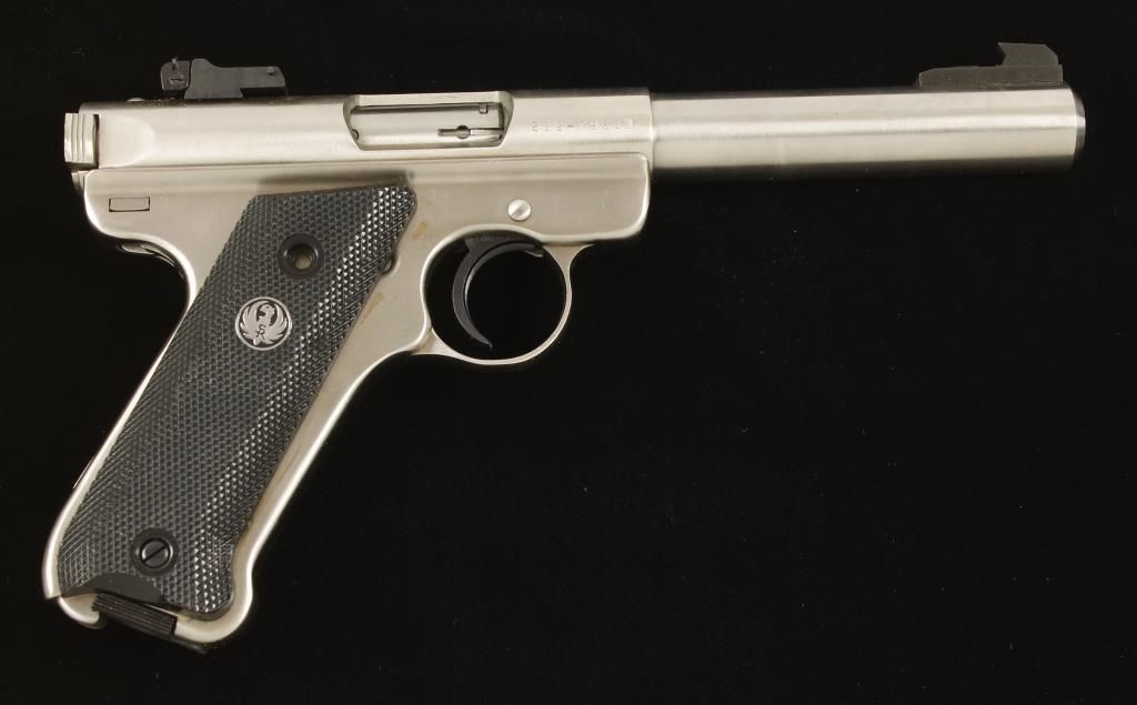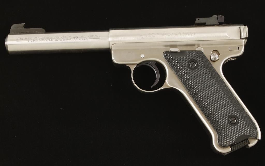 Single action semi auto rimfire target pistol with heavy 5-1/2" barrel. Stainless steel, checkered black plastic grips and adjustable rear target sight. Very good bore and action. Includes box and 1 magazine. Condition: Very good showing light use. Right grip panel missing upper screw. *Modern Firearm*
