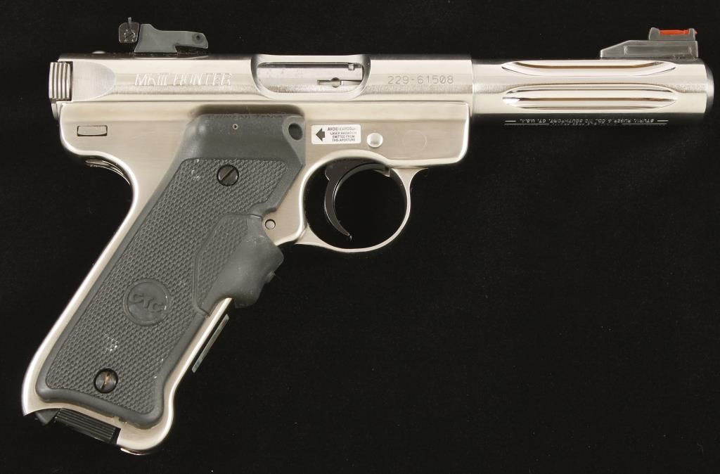 Single action semi auto rimfire target pistol with heavy fluted 4-1/2" barrel. Stainless steel, Crimson Trace laser grips, interchangeable Lightpipes front sight and adjustable rear target sight. Very good bore and action. Includes original box, manual, scope base, and 2 magazines. Condition: Excellent *Modern Firearm*