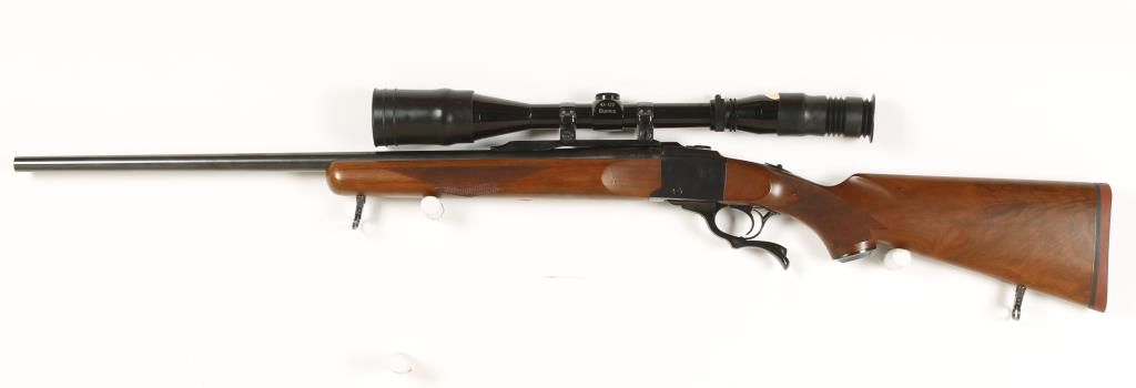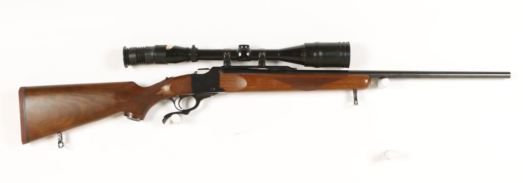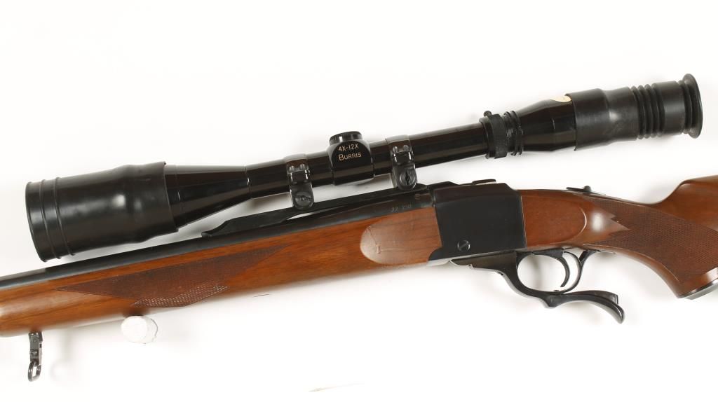 Single shot falling block type action rifle with 26" barrel. Blued finish, checkered pistol grip walnut stock, tang safety and no sights. Fitted with Burris 4-12X A.O. lens scope. Good bore and action. Condition: Very good showing small dents in stock on left side. *Modern Firearm*