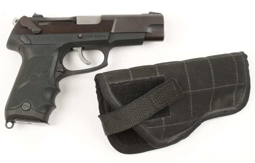 Double action semi auto pistol with 4-1/2" barrel. Blued steel slide, black alloy frame, Hogue pebbled rubber grips, ambidextrous safety, and 3-dot sight. Very good bore and action. Includes nylon holster and 1 magazine. Condition: Very good showing very light use.