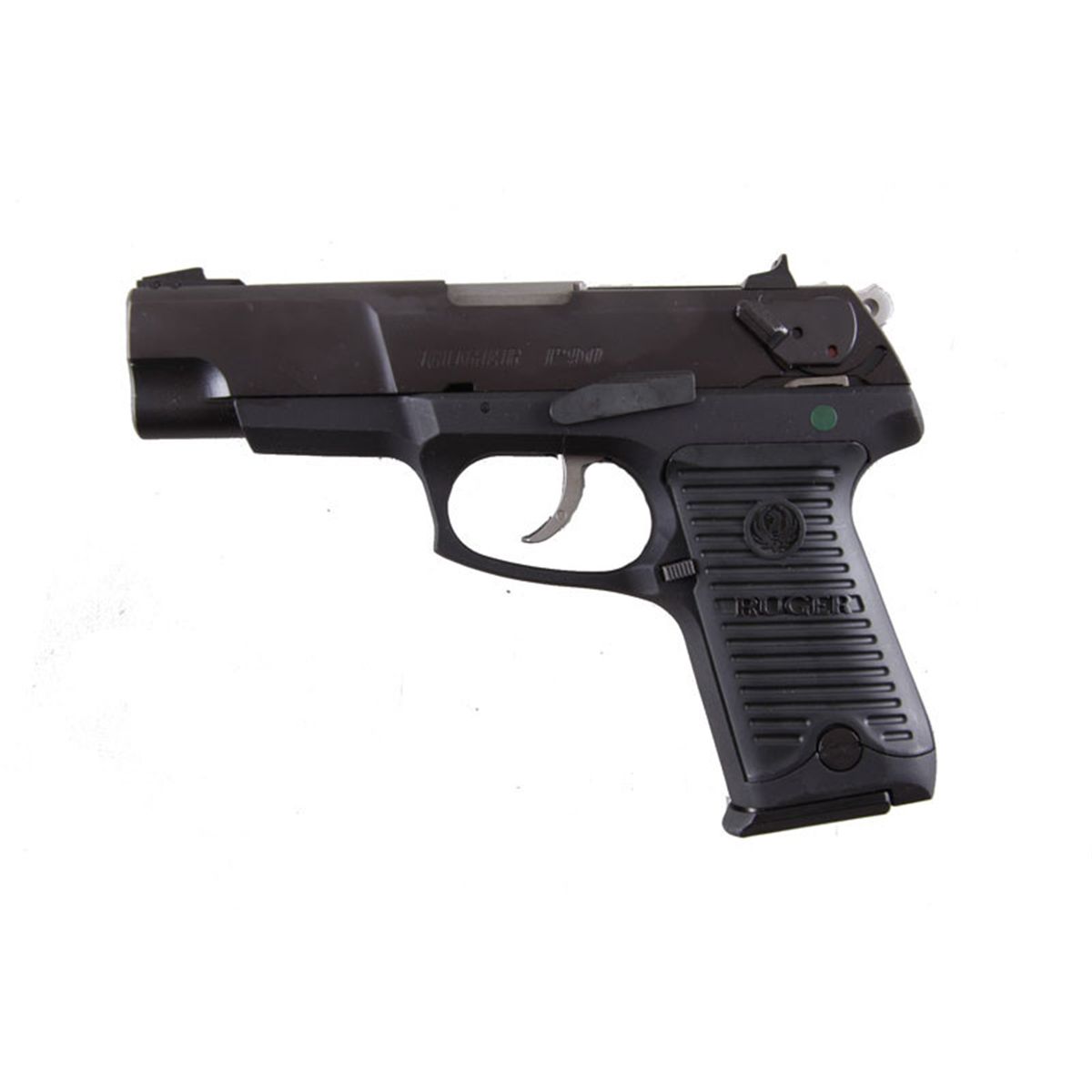 Ruger Mdl P90 Cal .45acp SN:663-80976 Double action/single action semi-auto 7 shot pistol with ambidextrous decocker/safety. Blued steel slide with black alloy frame and black grooved grips, 4 1/2" barrel with 3 dot fixed sights. Good bore and action. IDouble action/single action semi-auto 7 shot pistol with ambidextrous decocker/safety. Blued steel slide with black alloy frame and black grooved grips, 4 1/2" barrel with 3 dot fixed sights. Good bore and action. Included in grey plastic carry case with instructions, and gun lock. Condition: Near new with no sign of use. 2 magazines.