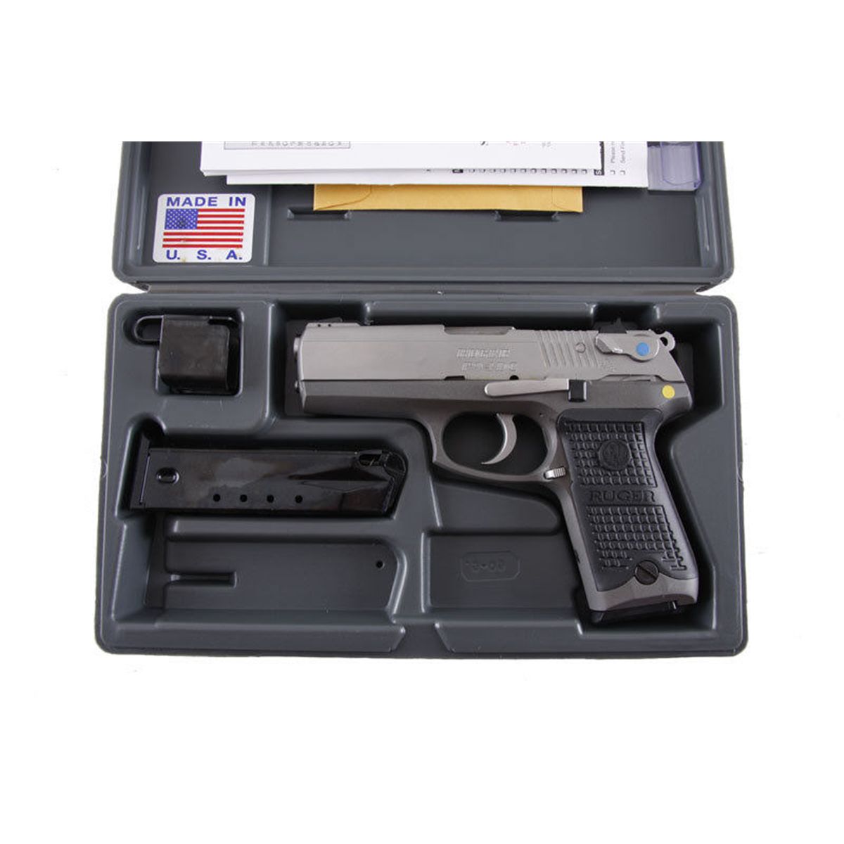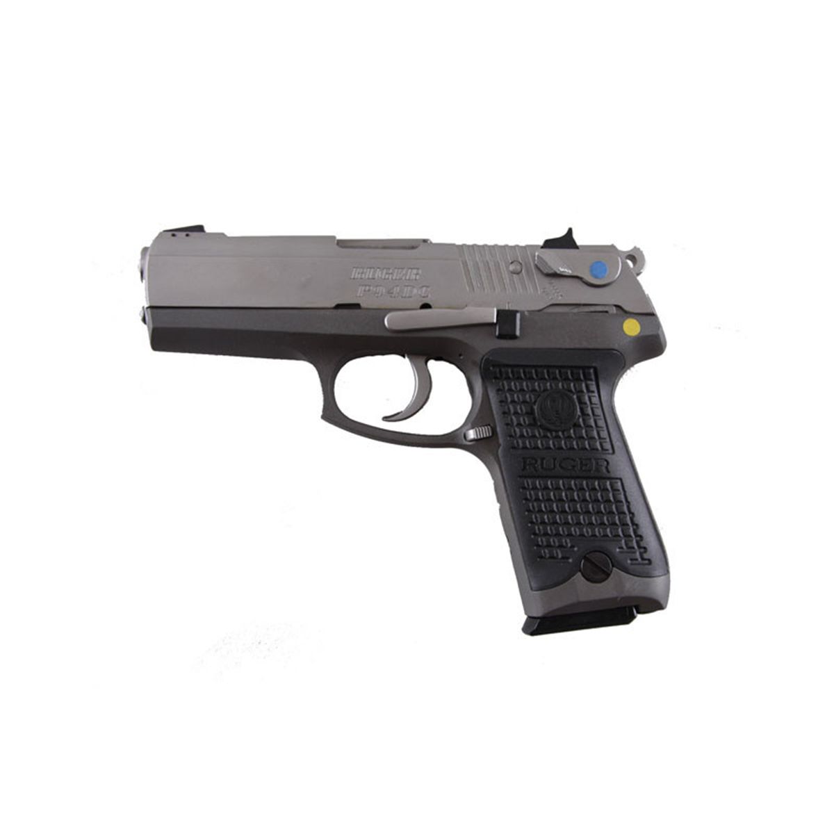 Ruger Mdl P94DC Cal .40S&W SN:341-51060 Double action 10 shot semi-auto pistol with decocker. Stainless finish slide with matte aluminum alloy frame, black checkered hard rubber grips, 4" barrel with 3 white dot drift adjustable sights, good bore and acDouble action 10 shot semi-auto pistol with decocker. Stainless finish slide with matte aluminum alloy frame, black checkered hard rubber grips, 4" barrel with 3 white dot drift adjustable sights, good bore andaction. Included in grey plastic carry case with instructions, and gun lock. Condition: Near new with no sign of use. 2 magazines. 'NOT CALIFORNIA LEGAL"
