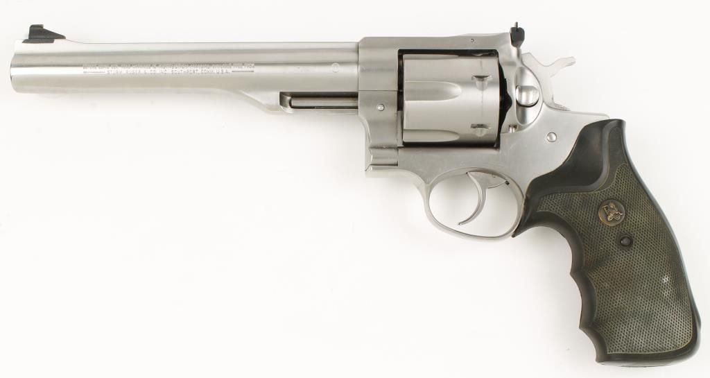 Large frame double action revolver with 7-1/2" barrel. Stainless steel, checkered black rubber finger groove Pachmayr grips, bead front sight and adjustable rear sight. Very good bore ands action. Condition: Very good showing cylinder ring.