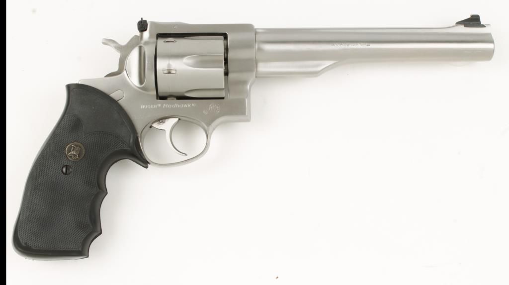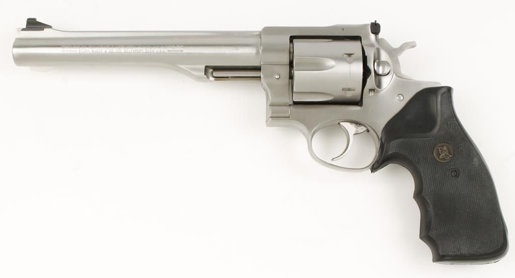 Large frame double action revolver with 7-1/2" barrel. Stainless steel, checkered black rubber finger groove Pachmayr grips, bead front sight and adjustable rear sight. Very good bore ands action. Condition: Very good showing cylinder ring.