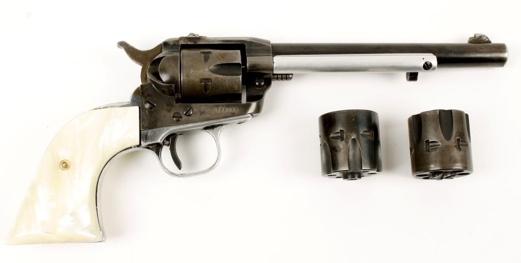 Early model single action rimfire revolver with 6-1/2" barrel. Blued finish, mother of pearl grips, aluminum alloy grip strap, trigger guard and ejector rod housing, no transfer bar and fixed sights. Good bore and action. Includes extra long rifle cylinder and extra magnum cylinder. Condition: Fair showing little finish remaining and a name and numbers engraved in bottom of barrel. *Modern Firearm*