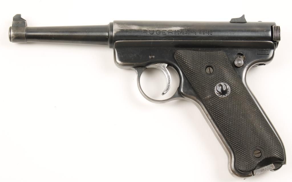 Early single action semi auto rimfire pistol made in the late 1950's with 4-3/4" barrel. Blued finish, checkered black plastic grips with silver/black medallions and fixed sights. Good bore and action. Includes 1 magazine. Condition: Good overall showing holster wear, bluing wear on grip straps and grips are good showing wear. *Curio & Relic Firearm*