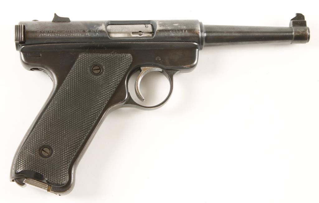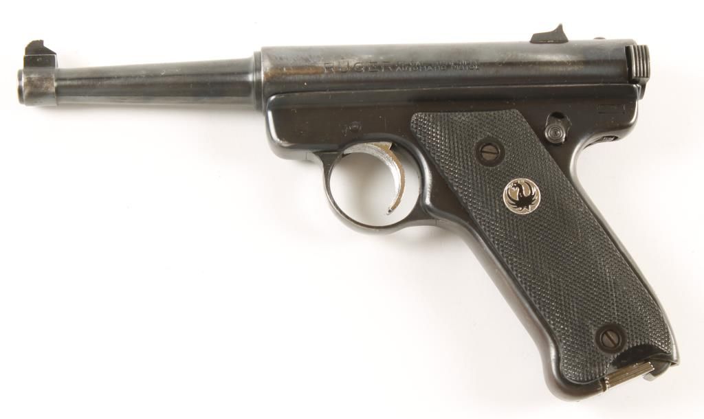 Single action semi auto rimfire pistol made in 1966 with 4-3/4" tapered barrel. Blued finish, checkered black plastic grips with black/silver medallion and fixed sights. Good bore and action. Includes 2 magazines. Condition: Good overall showing holster and high point wear. Grips are very good. *Modern Firearm*