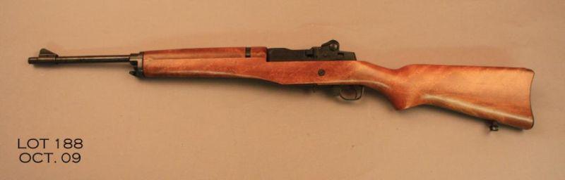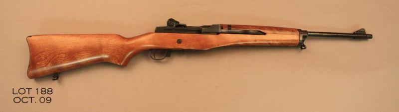 Ruger Mini 14, # 180-43374, .223 cal., blued finish, adjustable sights, smooth walnut stock with lanyard rings. This rifle is in excellent condition overall, bore is excellent, and appears to have been used little, if at all. Includesoriginal box, which is torn in several places and in fair condition, and manual, and one mag. Manufactured in 1976, and marked "Made in the 200th Year of American Liberty". Est. $250-$500.