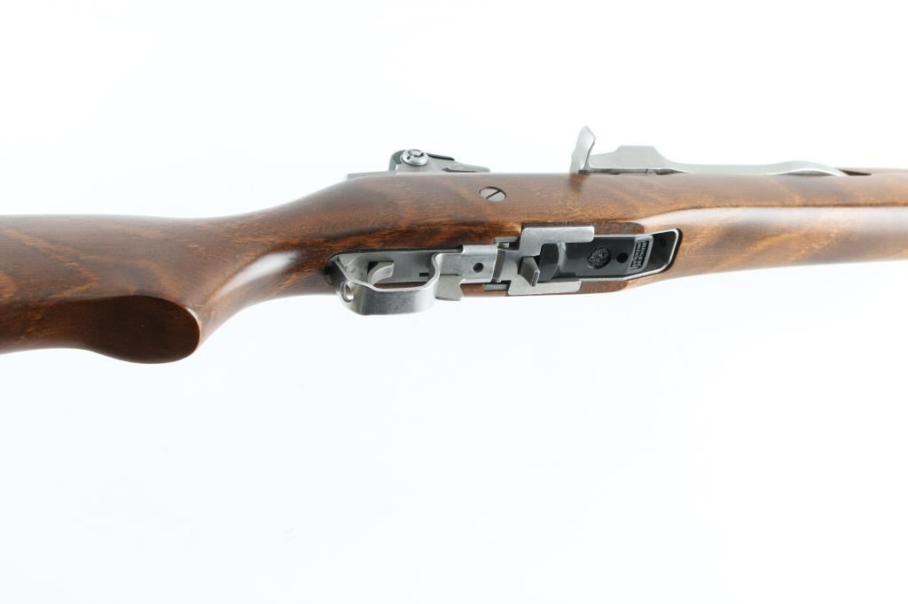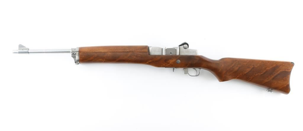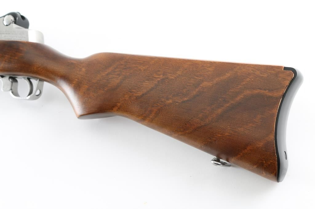 American made semi-auto rifle chambered for .223 Rem ammunition circa 1980. It features an 18.5" polished stainless steel barrel and more of a matte stainless receiver. It has a pinned, serrated blade front sight and an adjustable rear peep sight. It sports a very nice wood stock with swivels attached, matching wooden hand guard and a black plastic butt plate. Metal finish looks very good. The wood looks very good. Bore looks great, a little dirty. LOP is 13.25". Comes with one 5 round Ruger factory magazine. Condition is NRA Excellent *Modern Firarm*