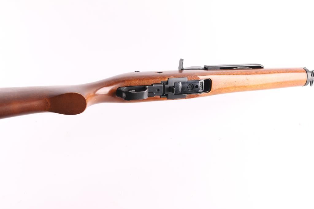 Semiautomatic rifle features blued steel construction, hardwood stock, black polymer handguard, 18" barrel, blade front sight, adjustable rear peep sight, manual safety, sling swivels. Function is good. Bore is very good condition. Metal shows very good or better condition with signs of handling and use. Stock is very good or better condition with few scratches. Includes one 5 round magazine,