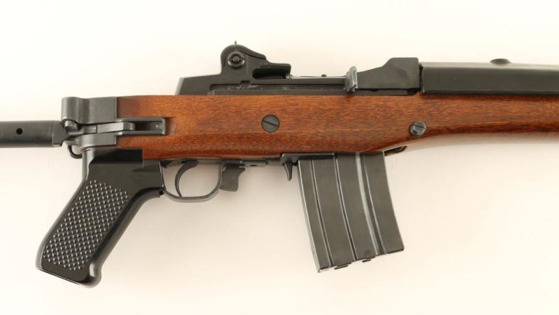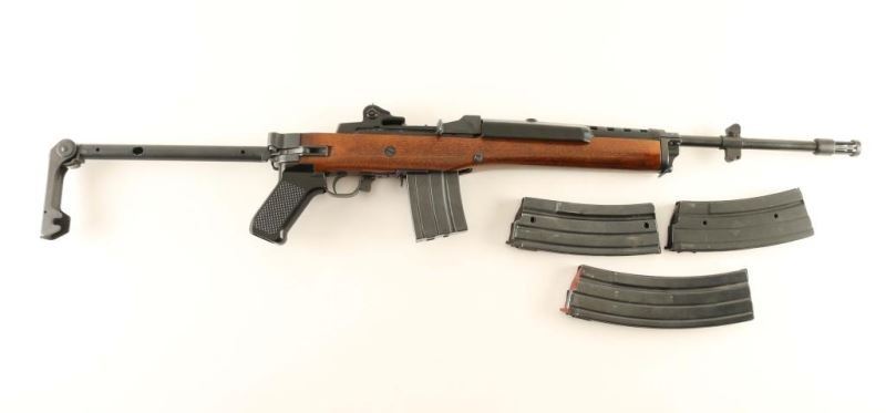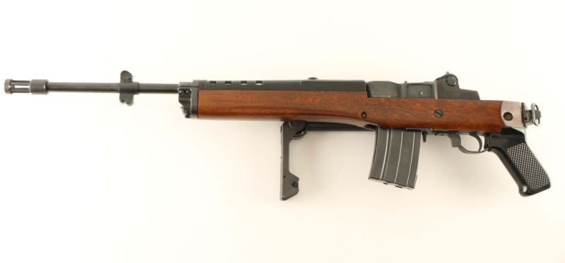 'Government Bayonet' American made semi-automatic sporting rifle built along the lines of a scaled-down M14 and chambered in .223 Remington, circa 1979. The GB models were sold to law enforcement, military and private security firms but some have made it to the civilian market. Features a blued finish, 18.5" threaded barrel with flash hider & bayonet lug, winged blade front sight, adjustable rear aperture sight, smooth trigger, investment cast receiver, bolt hold open, 20 round magazine, manual safety, sling swivels, black polymer hand guard, and smooth wood stock with polymer pistol grip & side folding tubular metal stock. Includes three additional magazines (2) 30 round & (1) 40 round. Rifle shows little wear but has some light surface rust forming on the rear sling swivel and stock attachment. Action is smooth, bore is excellent and wood stock is new fine. Condition is NRA near excellent. ***Modern Firearm***