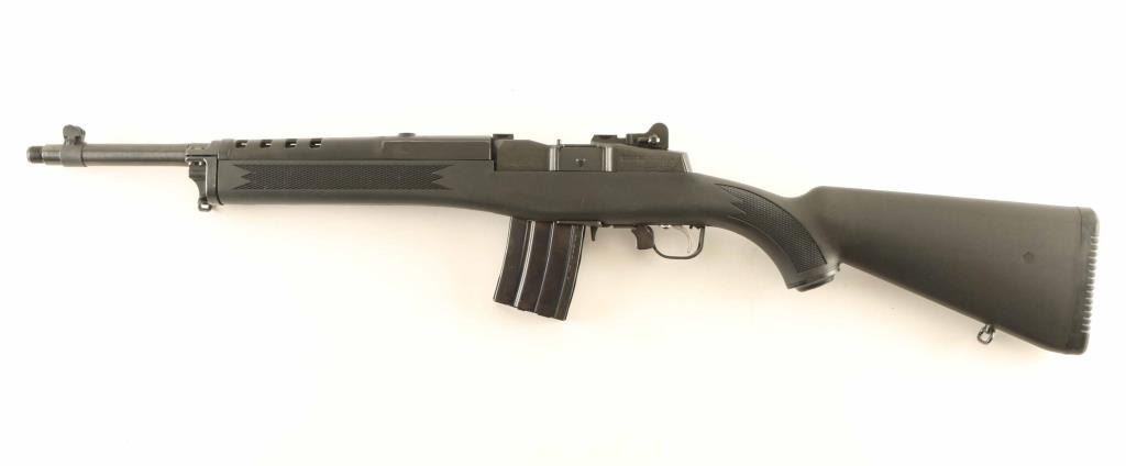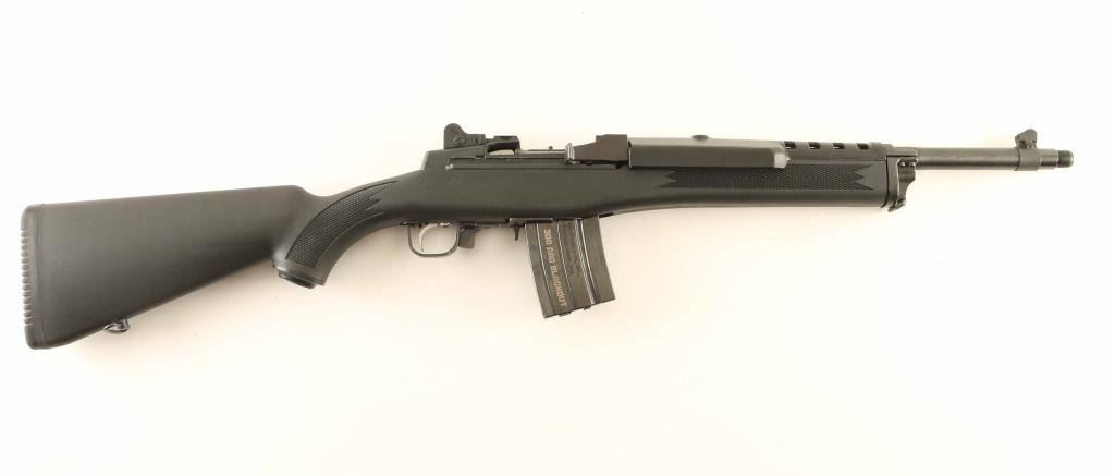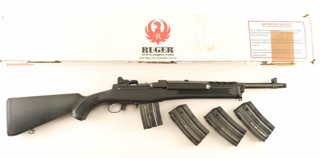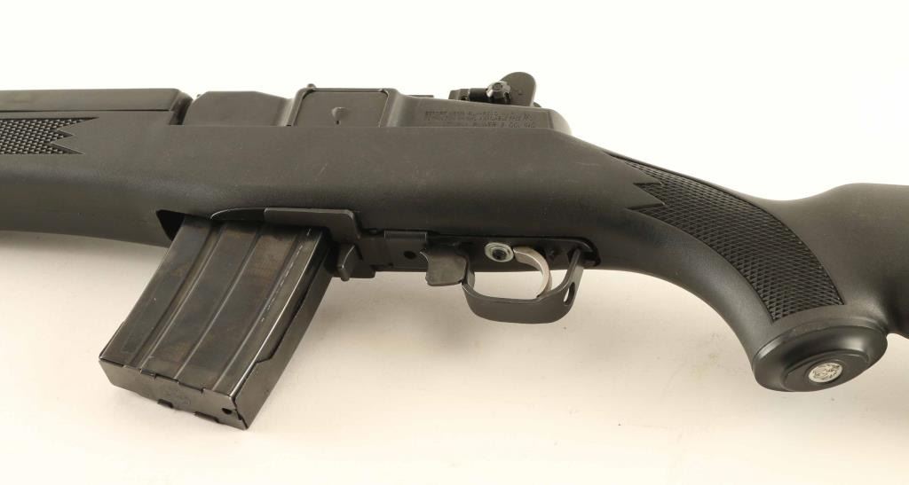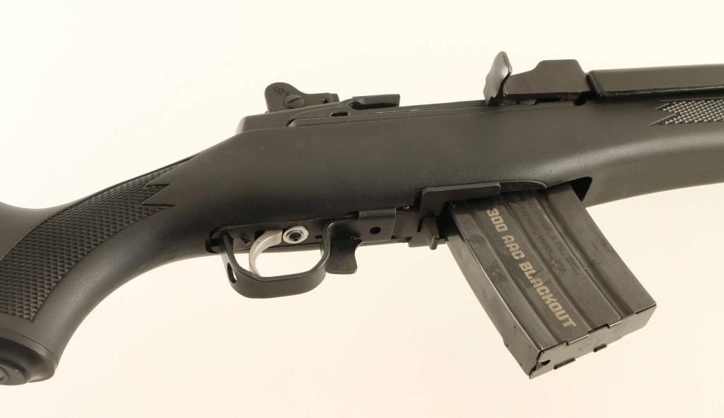 'Ranch Rifle' Gas operated semi-automatic sporting rifle chambered in .300 Blackout. Features a blued finish, 16.2" threaded barrel, shrouded blade front sight, adjustable Tech-SIGHT MINI200 aperture rear sight, integral scope base cuts in the receiver, smooth trigger, manual safety, factory 20 round detachable magazine, investment cast receiver, sling swivels, ventilated black polymer hand guard and one-piece checkered black synthetic pistol grip shoulder stock with rubber recoil pad. Includes the original factory cardboard box with lock, rings and three spare 20 round factory magazines. Rifle retains approximately 94% of it's original finish showing light handling marks, finish loss on the integral scope bases and light action wear on the receiver & bolt. Action is smooth, the bore is excellent, and the synthetic stock is fine. Condition is NRA Very Good++ in box. ***Modern Firearm***